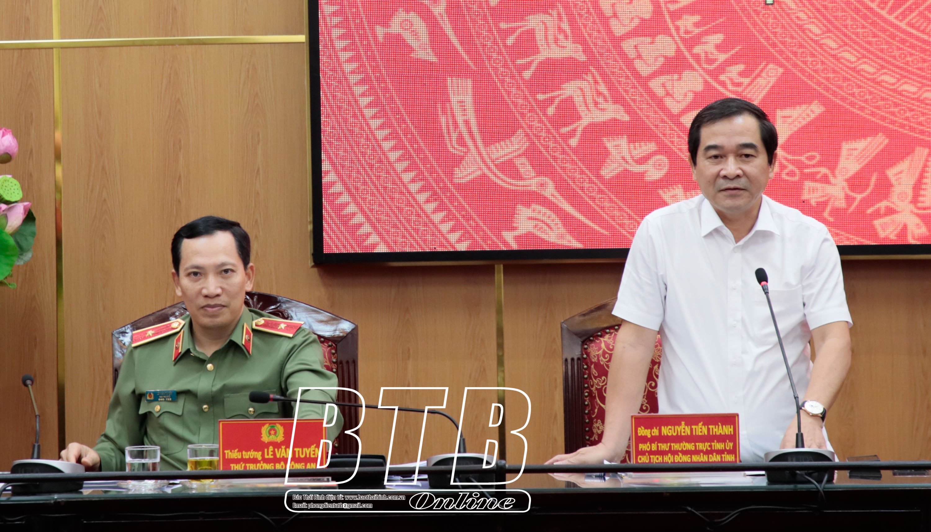 Phát biểu tại buổi làm việc, đồng chí Nguyễn Tiến Thành, Phó Bí thư thường trực Tỉnh ủy, Chủ tịch HĐND tỉnh cảm ơn Bộ Công an, cá nhân đồng chí Thứ trưởng đã quan tâm, dành nhiều thời gian, hỗ trợ địa phương và lực lượng Công an Thái Bình thực hiện tốt nhiệm vụ. Do vậy, Công an tỉnh đã có những bước chuyển biến tích cực, bảo đảm tốt ANTT, góp phần thực hiện thắng lợi nhiệm vụ phát triển kinh tế - xã hội trên địa bàn. Đồng chí mong muốn Bộ Công an tiếp tục quan tâm lãnh đạo, chỉ đạo, hỗ trợ lực lượng Công an Thái Bình thực hiện thắng lợi các nhiệm vụ chính trị được giao.