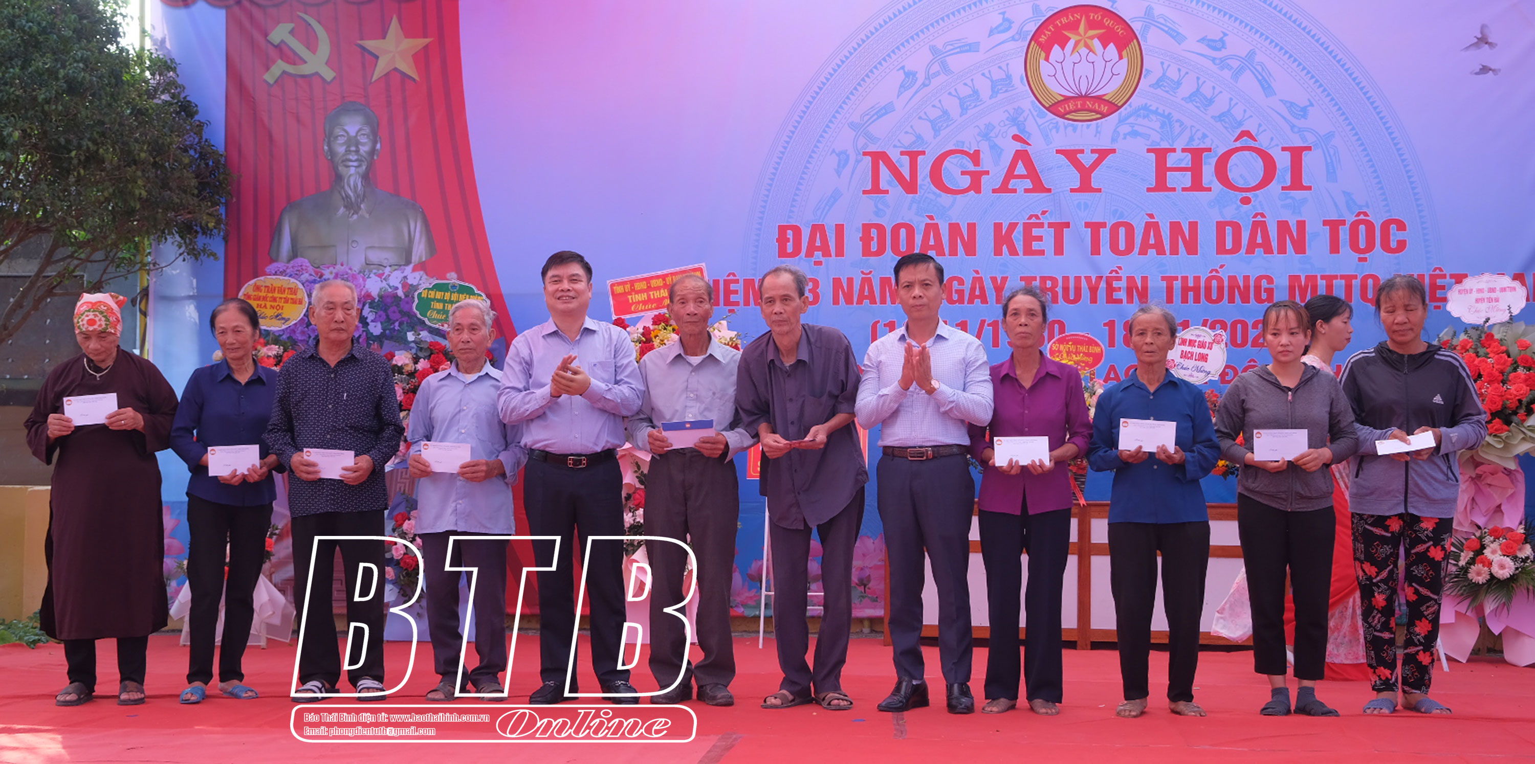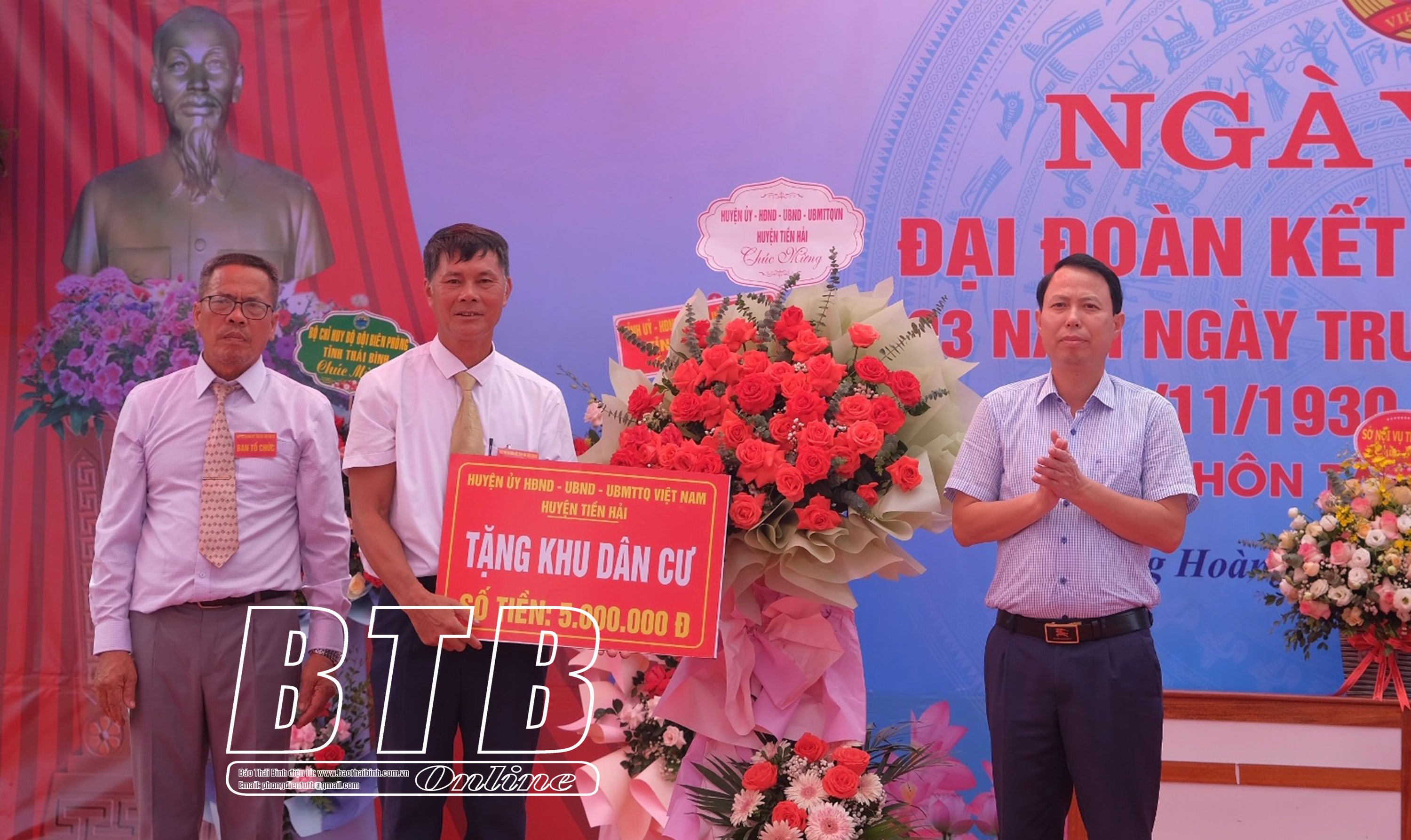 Nhân dịp này, đồng chí Chủ nhiệm Ủy ban Kiểm tra Tỉnh ủy và lãnh đạo huyện Tiền Hải đã trao quà cho khu dân cư; trao quà động viên các hộ nghèo, hộ có hoàn cảnh khó khăn; khen thưởng các gia đình có thành tích xuất sắc trong thực hiện cuộc vận động “Toàn dân đoàn kết xây dựng nông thôn mới, đô thị văn minh”.