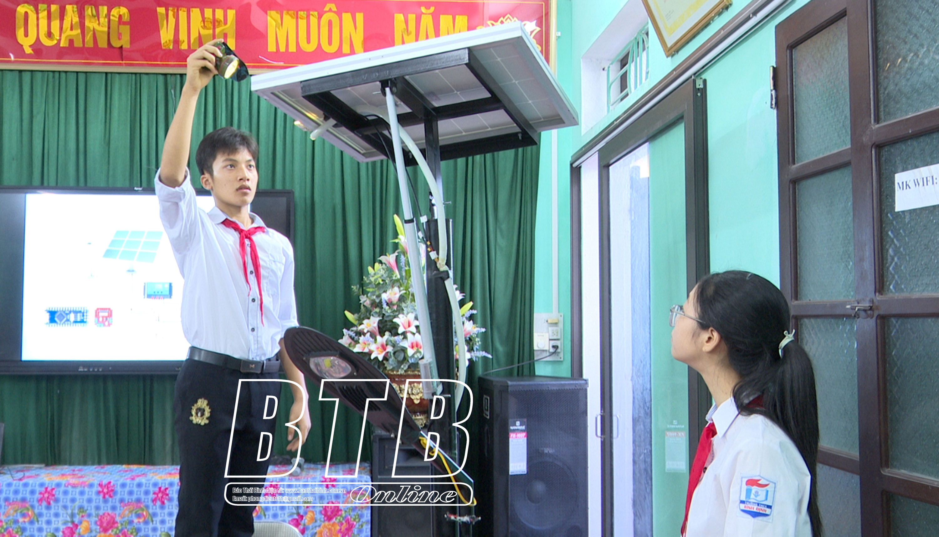 Học sinh Trường THCS Bình Định thuyết trình dự án hệ thống chiếu sáng thông minh tự động thích ứng theo hướng mặt trời.