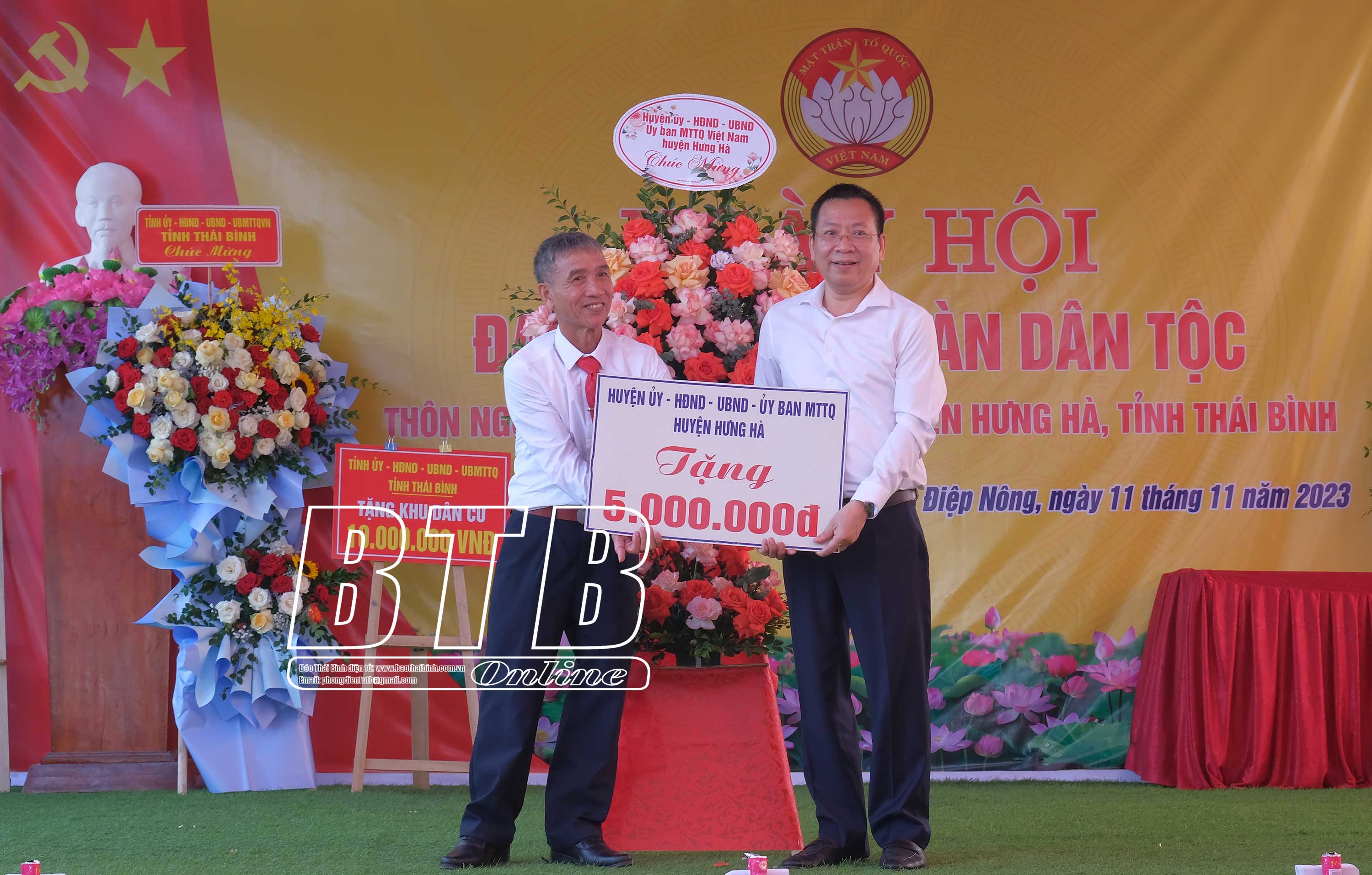 Lãnh đạo huyện Hưng Hà tặng hoa và trao quà cho thôn Ngũ Đông.