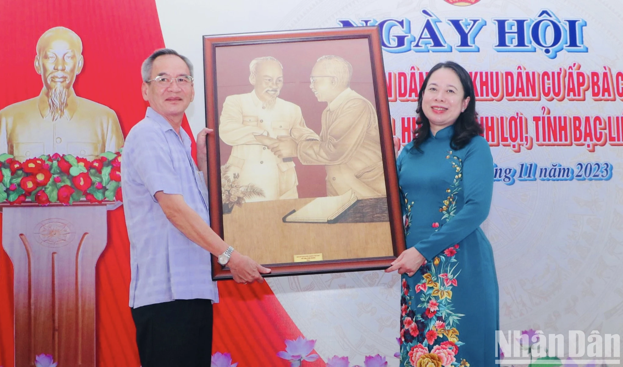 Phó Chủ tịch nước trao tặng lãnh đạo tỉnh Bạc Liêu bức tranh Bác Hồ và Bác Tôn tại ngày hội.