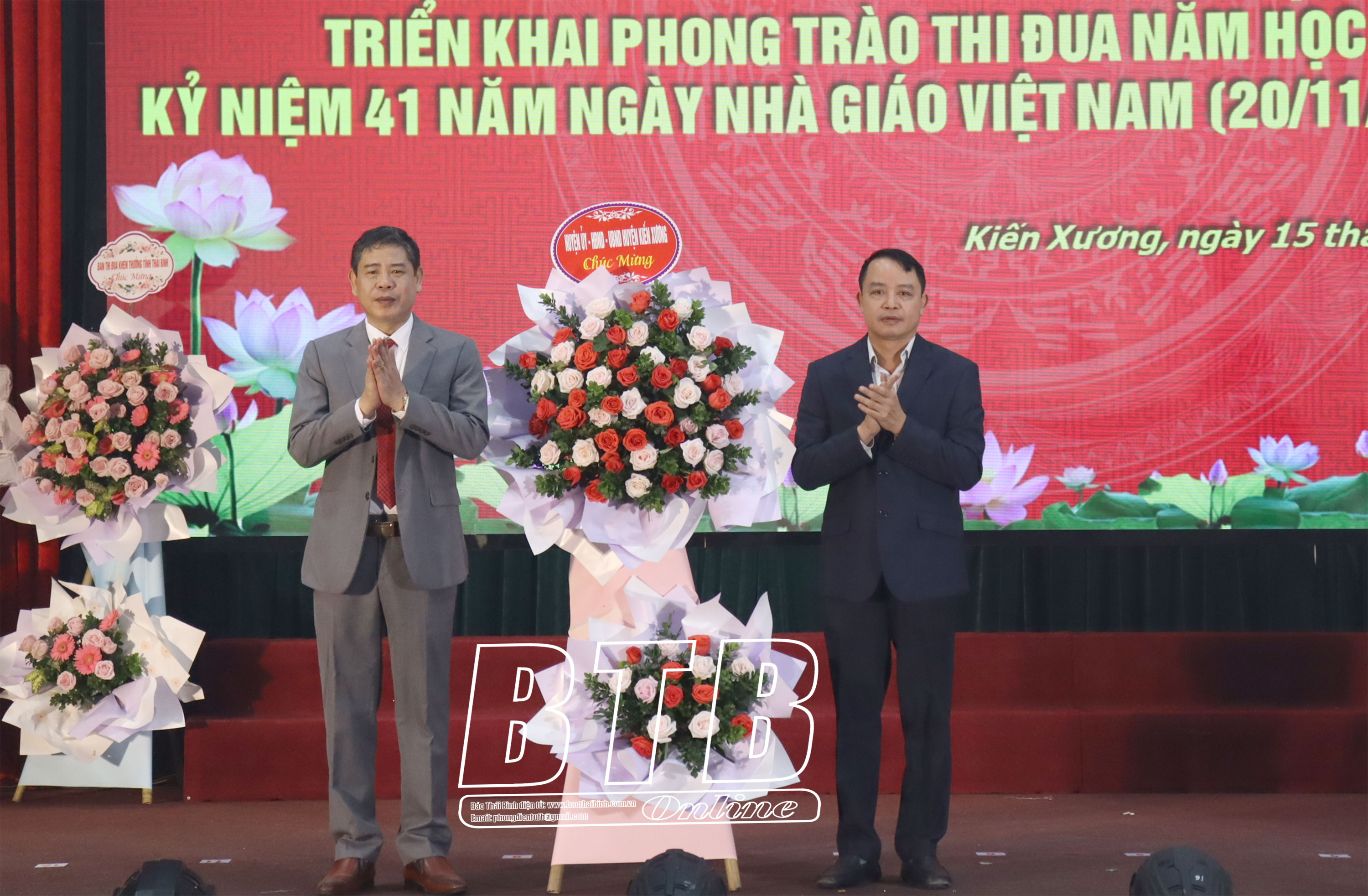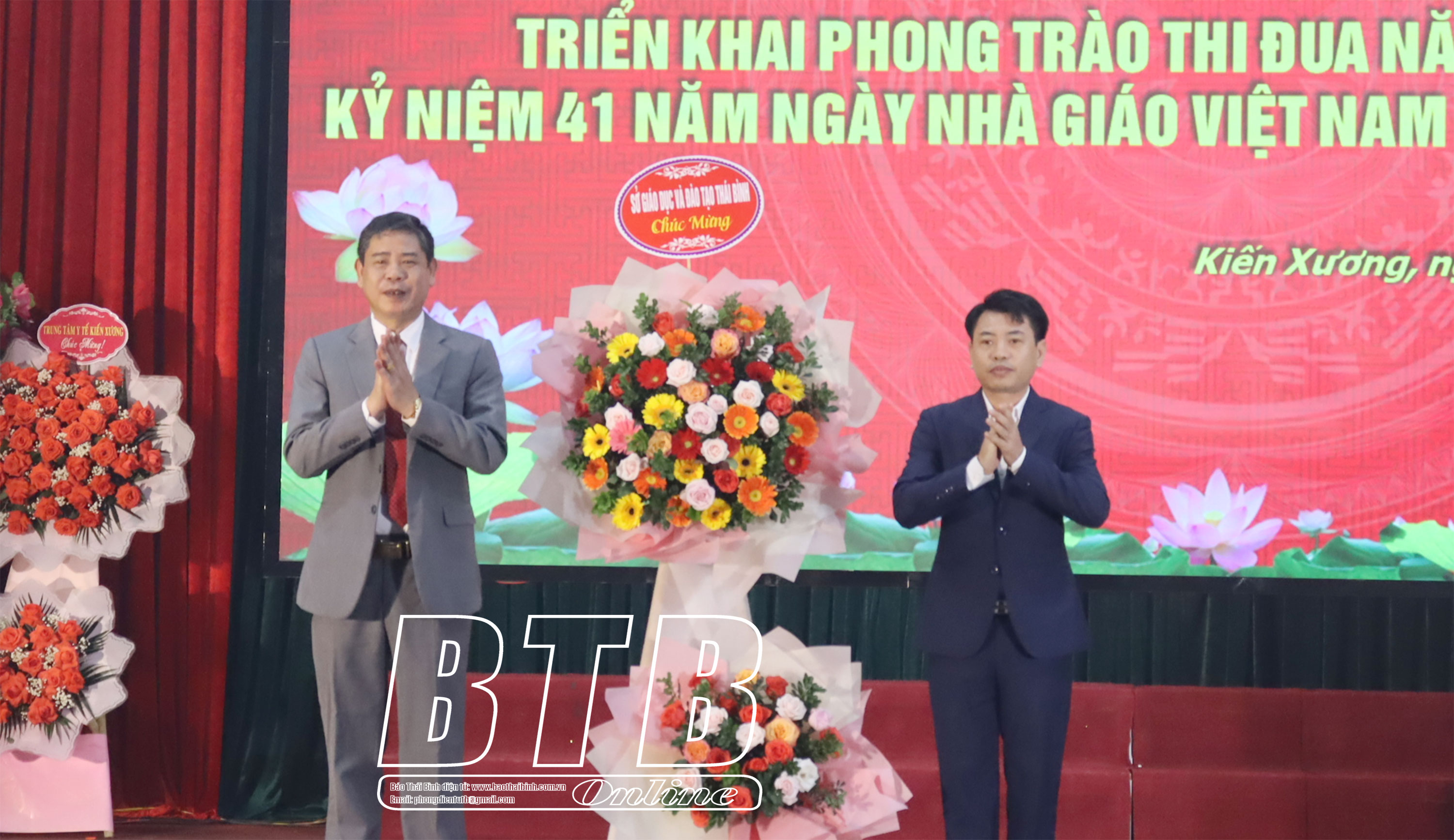 Lãnh đạo huyện Kiến Xương tặng hoa chúc mừng.