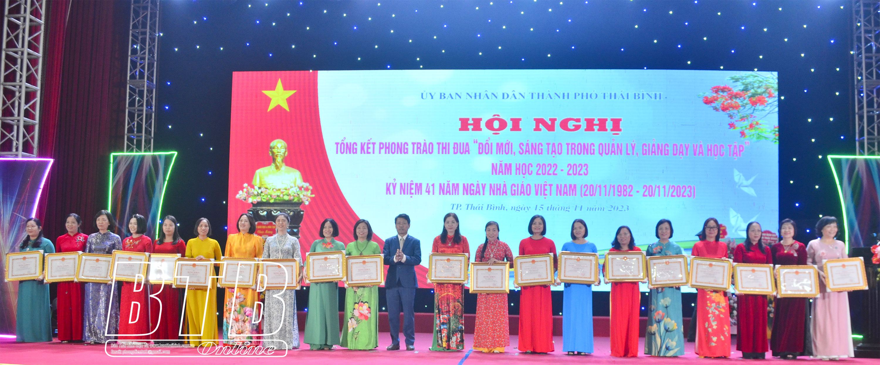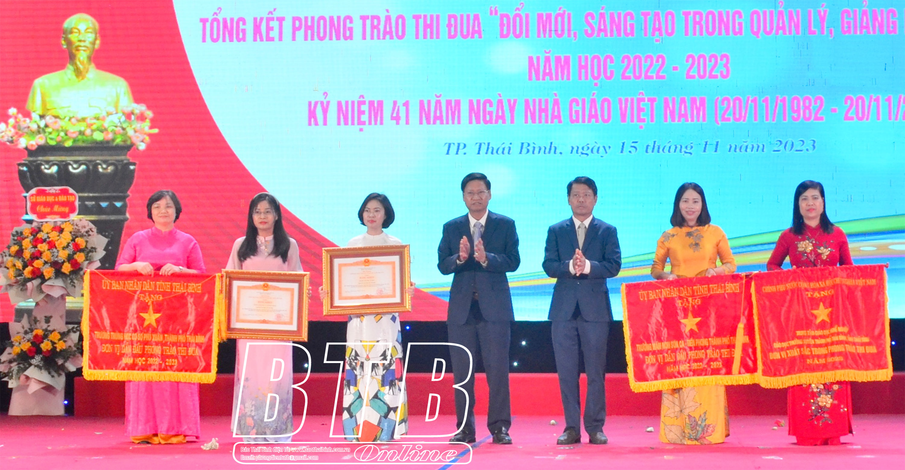 Sáng ngày 15/11, UBND thành phố Thái Bình tổ chức tổng kết phong trào thi đua “Đổi mới, sáng tạo trong quản lý, giảng dạy và học tập” năm học 2022 – 2023. Đến dự có các đồng chí: Nguyễn Quang Hưng, Ủy viên Ban Thường vụ Tỉnh ủy, Phó Chủ tịch thường trực UBND tỉnh; Hoàng Văn Thành, Ủy viên Ban Thường vụ Tỉnh ủy, Bí thư Thành ủy, Chủ tịch HĐND thành phố; lãnh đạo Sở Giáo dục và Đào tạo, thành phố Thái Bình, các thầy cô giáo và học sinh giỏi tiêu biểu, xuất sắc trên địa bàn thành phố.