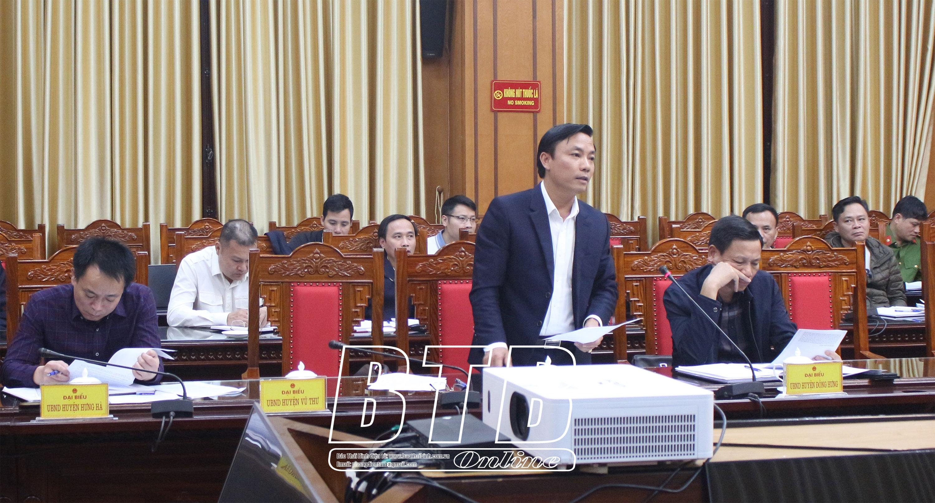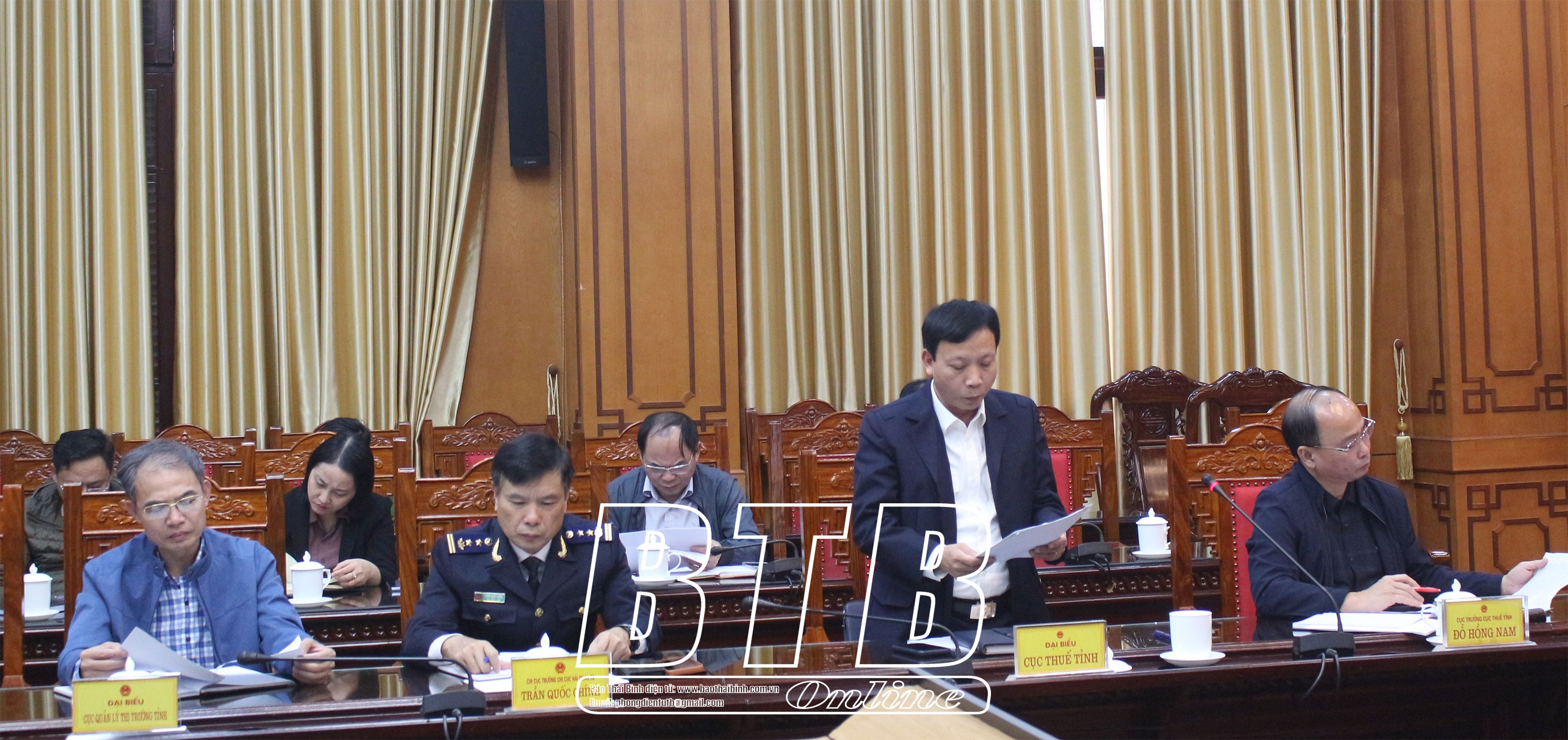 Lãnh đạo Cục Thuế tỉnh báo cáo tại cuộc họp.Lãnh đạo UBND huyện Kiến Xương phát biểu tại cuộc họp.