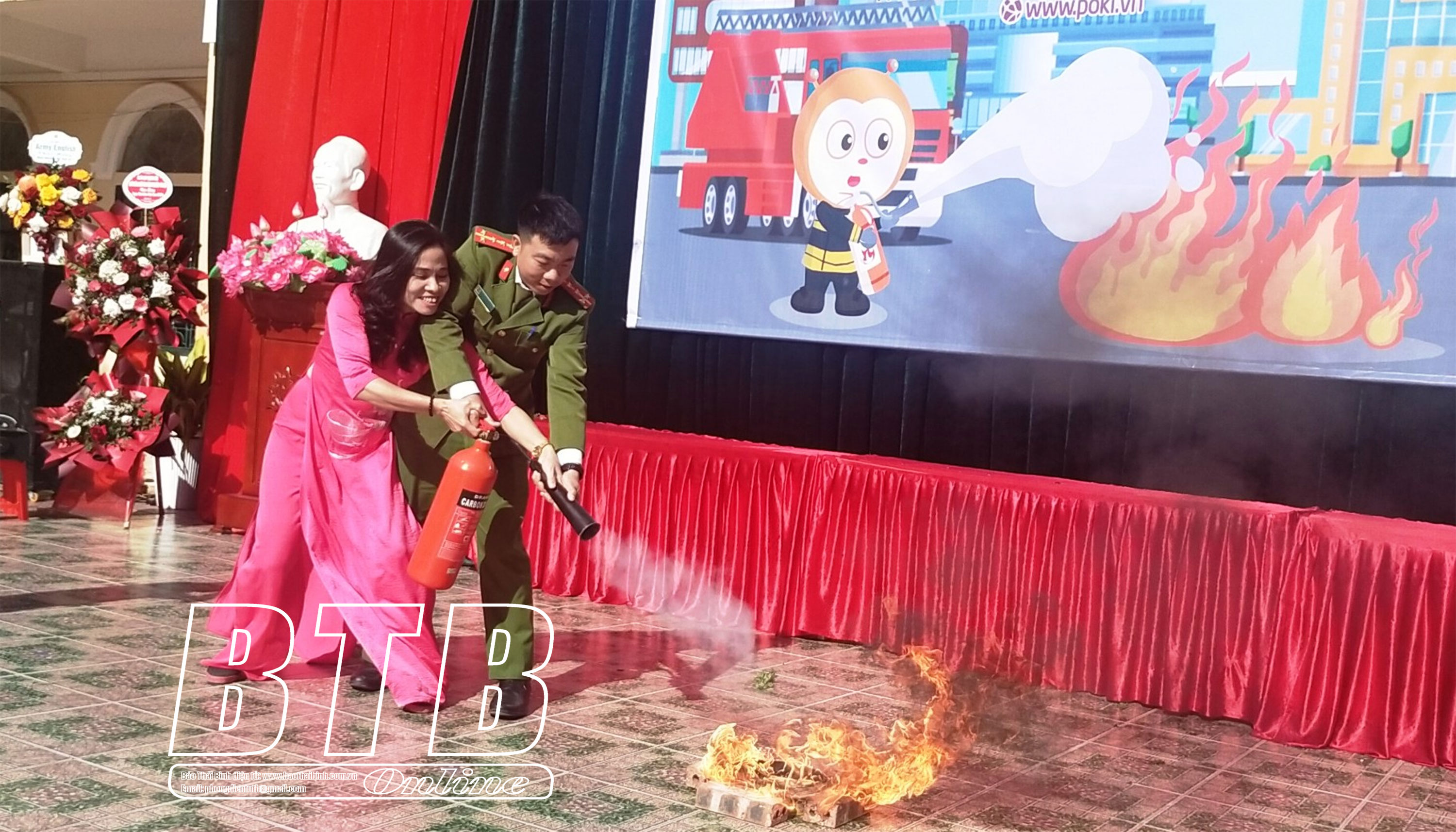 Giáo viên Trường Tiểu học Kim Đồng thực hành sử dụng bình cứu hỏa xử lý đám cháy bình gas.