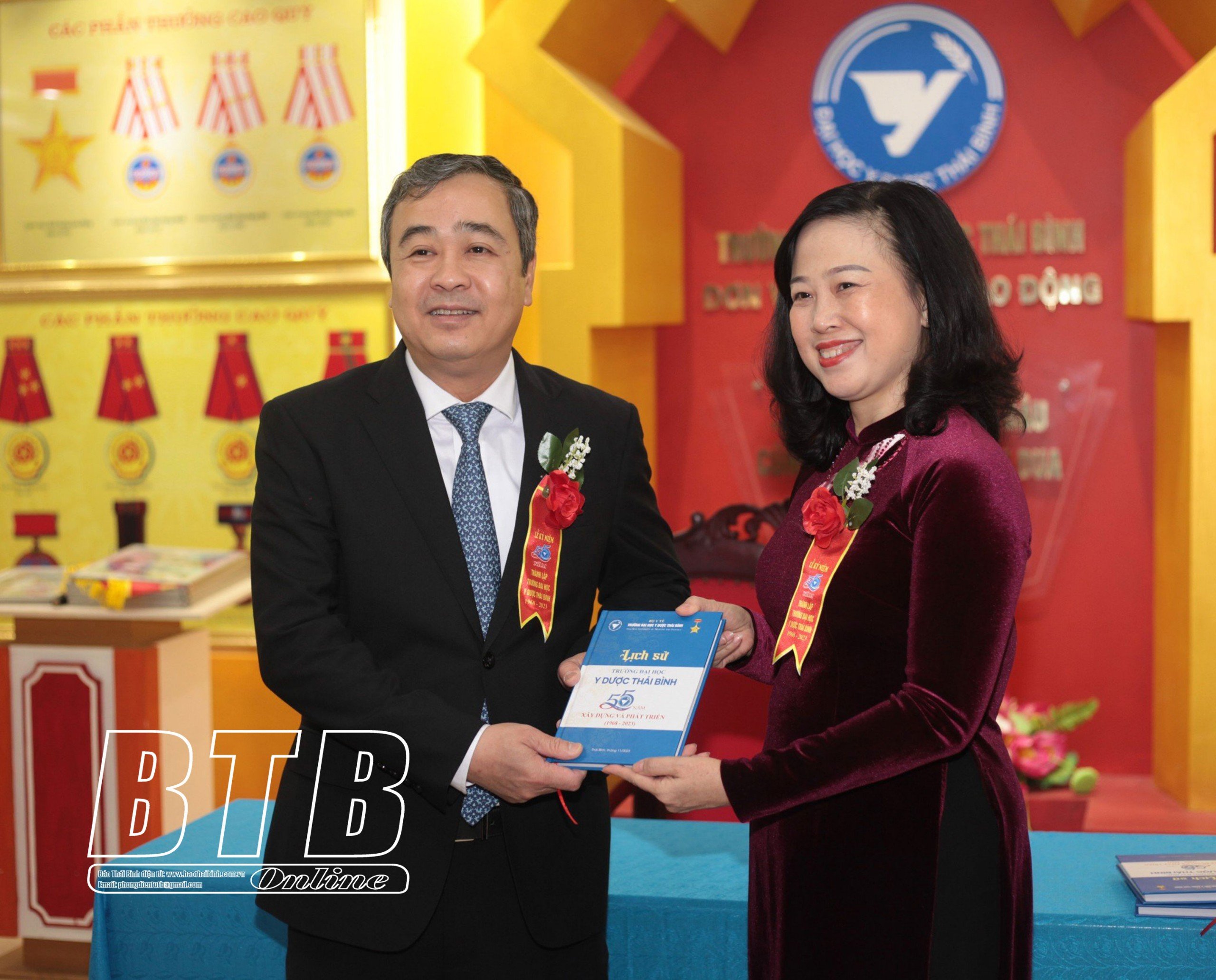 Đồng chí Đào Hồng Lan, Ủy viên Ban Chấp hành Trung ương đảng, Bộ trưởng Bộ Y tế tặng sách lịch sử  Trường Đại học Y Dược Thái Bình cho đồng chí  Bí thư Tỉnh ủy.