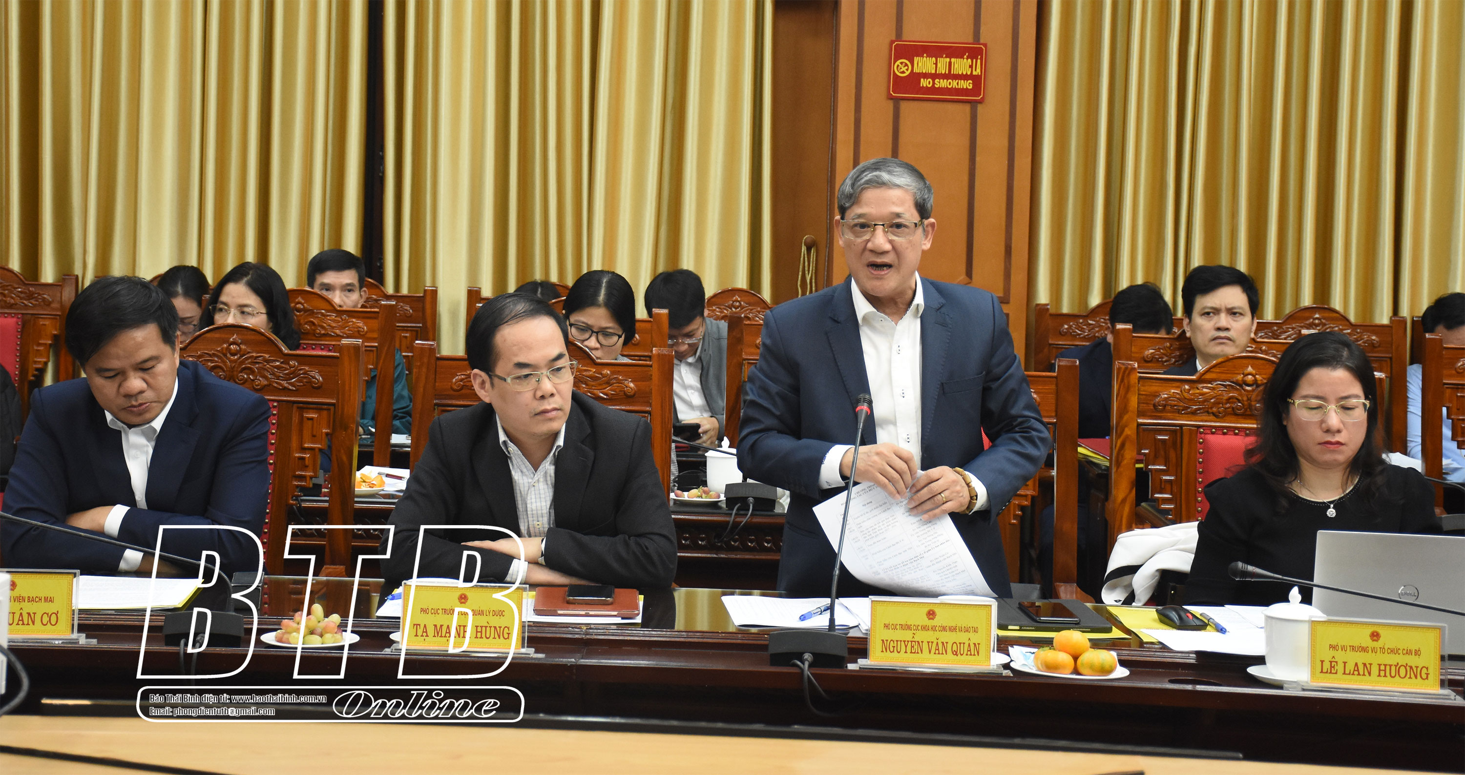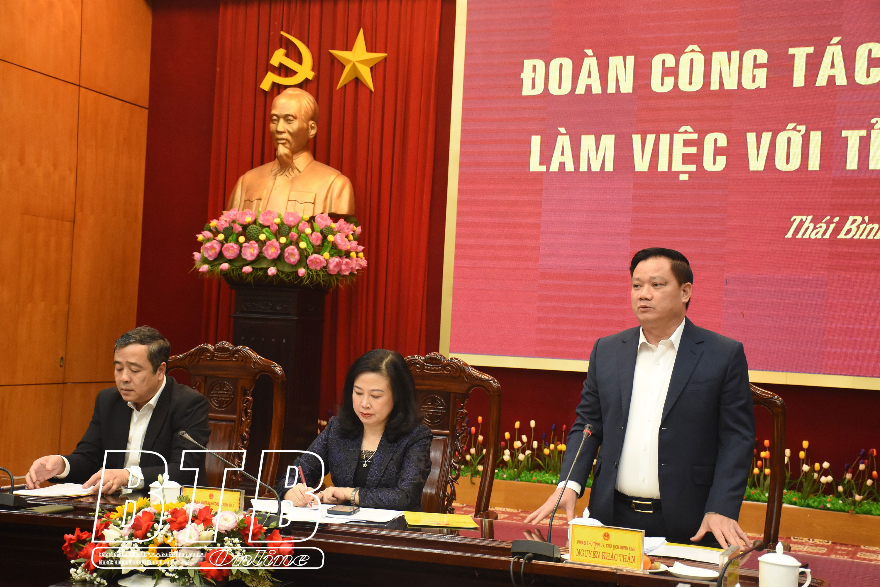 Phát biểu tại buổi làm việc, đồng chí Nguyễn Khắc Thận, Phó Bí thư Tỉnh ủy, Chủ tịch UBND tỉnh cảm ơn đồng chí Bộ trưởng Bộ Y tế và các thành viên đoàn công tác đã dành thời gian về thăm, làm việc tại tỉnh. Thông tin đến đoàn công tác những kết quả nổi bật về tình hình phát triển kinh tế - xã hội của tỉnh trong thời gian qua, đồng chí Phó Bí thư Tỉnh ủy, Chủ tịch UBND tỉnh nhấn mạnh: Thái Bình luôn xác định rõ phát triển kinh tế phải song hành với phát triển văn hóa, xã hội, trong đó lĩnh vực y tế được cấp ủy, chính quyền địa phương đặc biệt quan tâm. Những năm qua, Tỉnh ủy, HĐND, UBND tỉnh đã ban hành nhiều chủ trương, cơ chế, chính sách trong lĩnh vực y tế, bảo vệ, chăm sóc sức khỏe nhân dân; cơ sở vật chất, trang thiết bị y tế tại các cơ sở y tế của tỉnh được quan tâm đầu tư, nâng cấp; trình độ đội ngũ bác sĩ, nhân viên y tế từng bước được nâng cao. Bình quân toàn tỉnh có 13,5 bác sĩ/vạn dân; 40,4 giường bệnh/vạn dân; tỷ lệ bác sĩ, dược sĩ có trình độ sau đại học đạt 38,5%… Nhờ đó, công tác chăm sóc, bảo vệ sức khoẻ nhân dân đạt được nhiều kết quả tích cực.