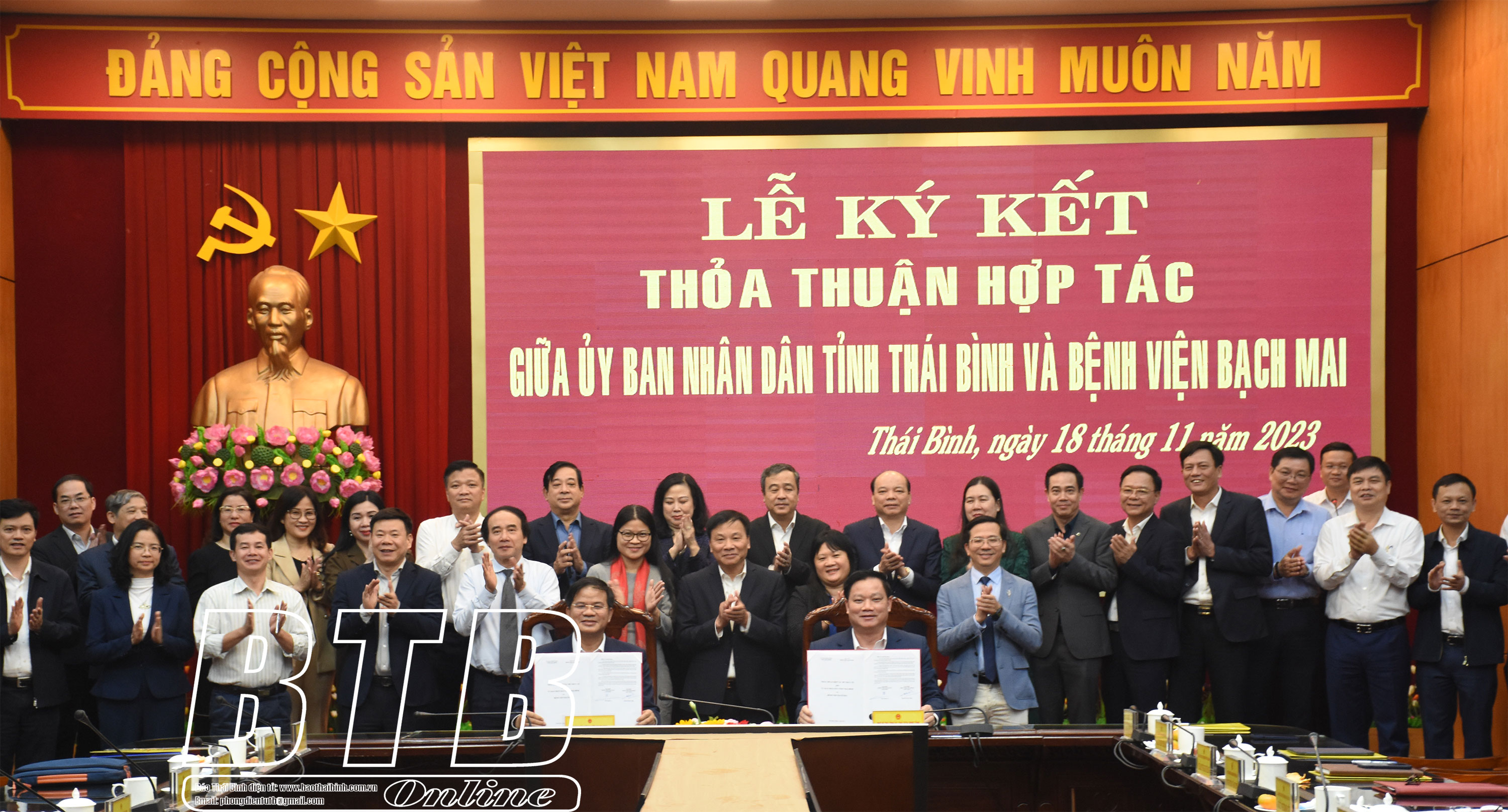 Cũng tại buổi làm việc, Bộ trưởng Bộ Y tế, các thành viên trong đoàn cùng các đồng chí lãnh đạo tỉnh đã chứng kiến lễ ký kết thoả thuận hợp tác hỗ trợ toàn diện về y tế giữa UBND tỉnh Thái Bình và Bệnh viện Bạch Mai giai đoạn 2023-2030.