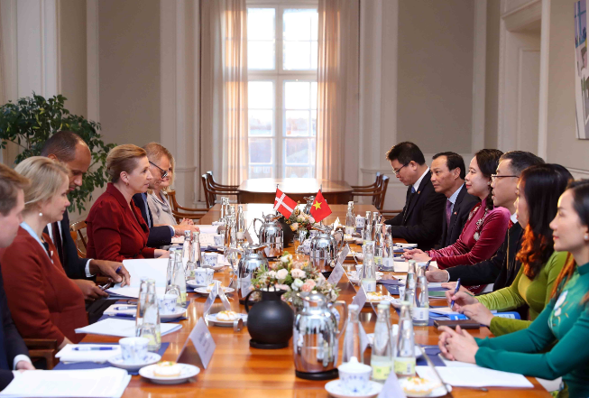 Thủ tướng Mette Frederiksen khẳng định, Chính phủ Đan Mạch coi trọng quan hệ hữu nghị, hợp tác và Đối tác toàn diện với Việt Nam - đối tác quan trọng trong việc triển khai chính sách đối ngoại của Đan Mạch tại khu vực châu Á-Thái Bình Dương, nhất là về thương mại-đầu tư; mong muốn củng cố, đẩy mạnh hơn nữa quan hệ hai nước về kinh tế, môi trường-khí hậu-năng lượng, phát triển xanh.