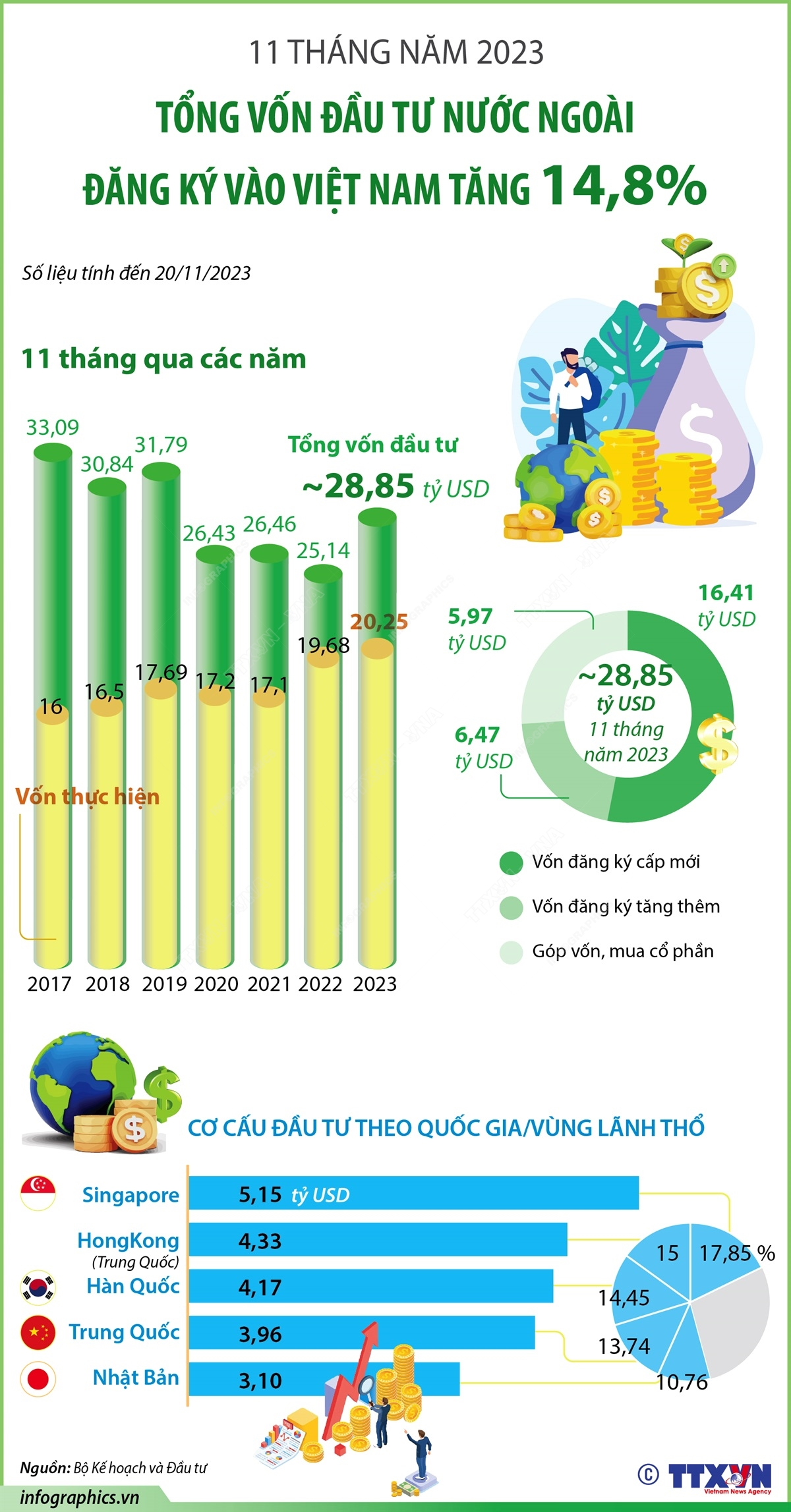 Tính đến 20/11/2023, tổng vốn đăng ký cấp mới, điều chỉnh và góp vốn mua cổ phần, mua phần vốn của nhà đầu tư nước ngoài (FDI) đạt gần 28,85 tỷ USD, tăng 14,8% so với cùng kỳ năm 2022.