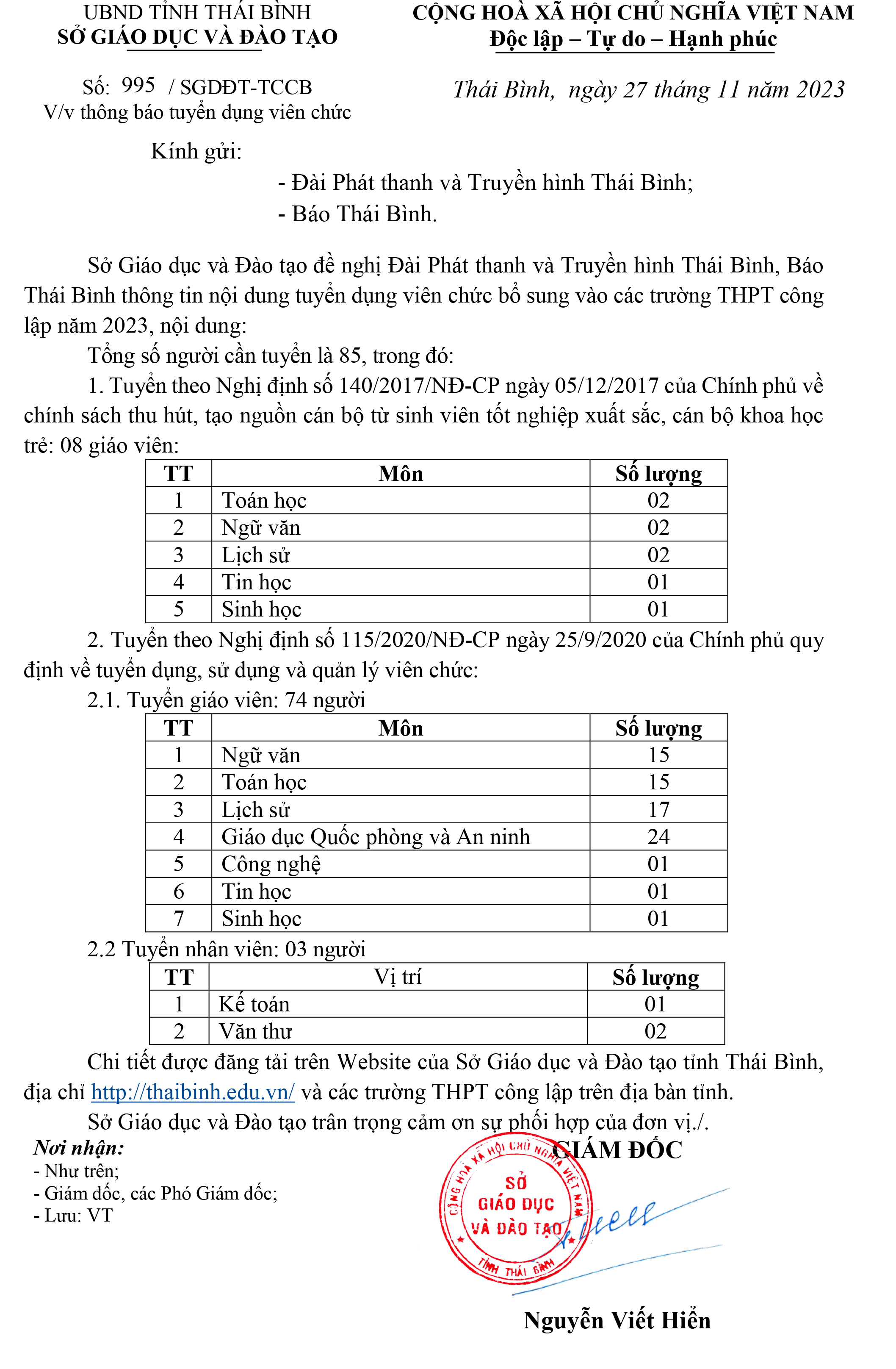Sở Giáo dục và Đào tạo Thái Bình: Thông báo tuyển dụng viên chức