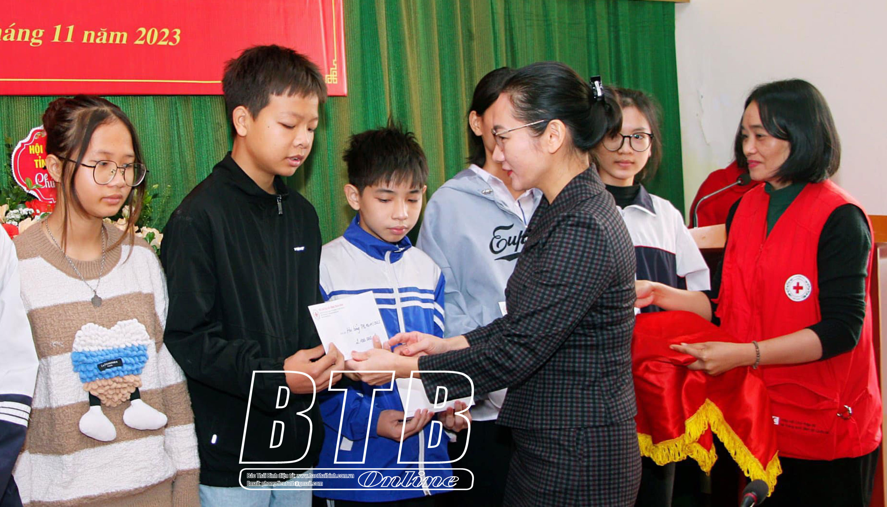 Đại diện Hội Chữ thập đỏ tỉnh trao học bổng cho các em học sinh nghèo vượt khó học giỏi.