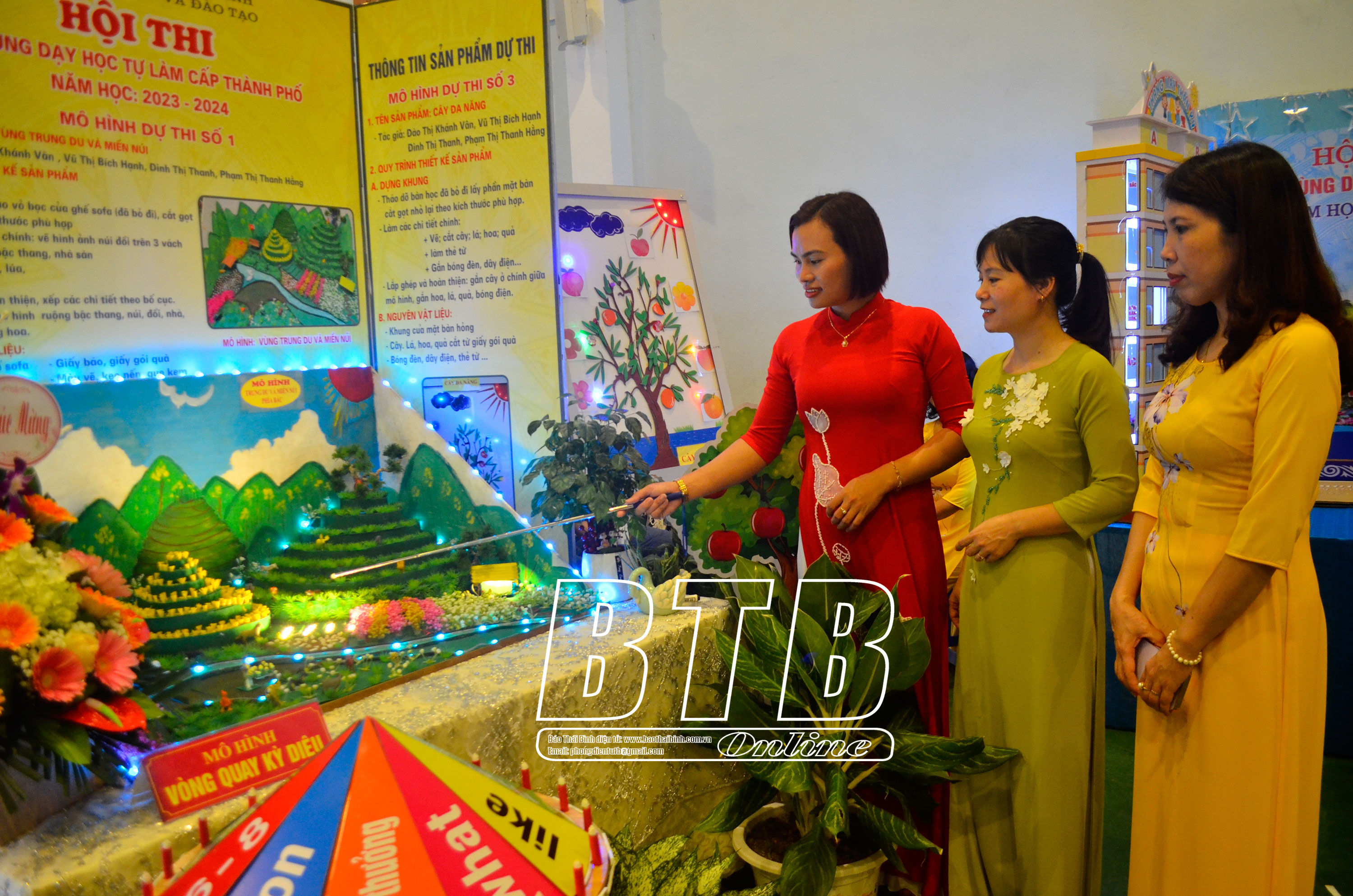 Lãnh đạo Sở Giáo dục và Đào tạo, UBND thành phố tham quan đồ dùng dạy học tự làm của giáo viên.
