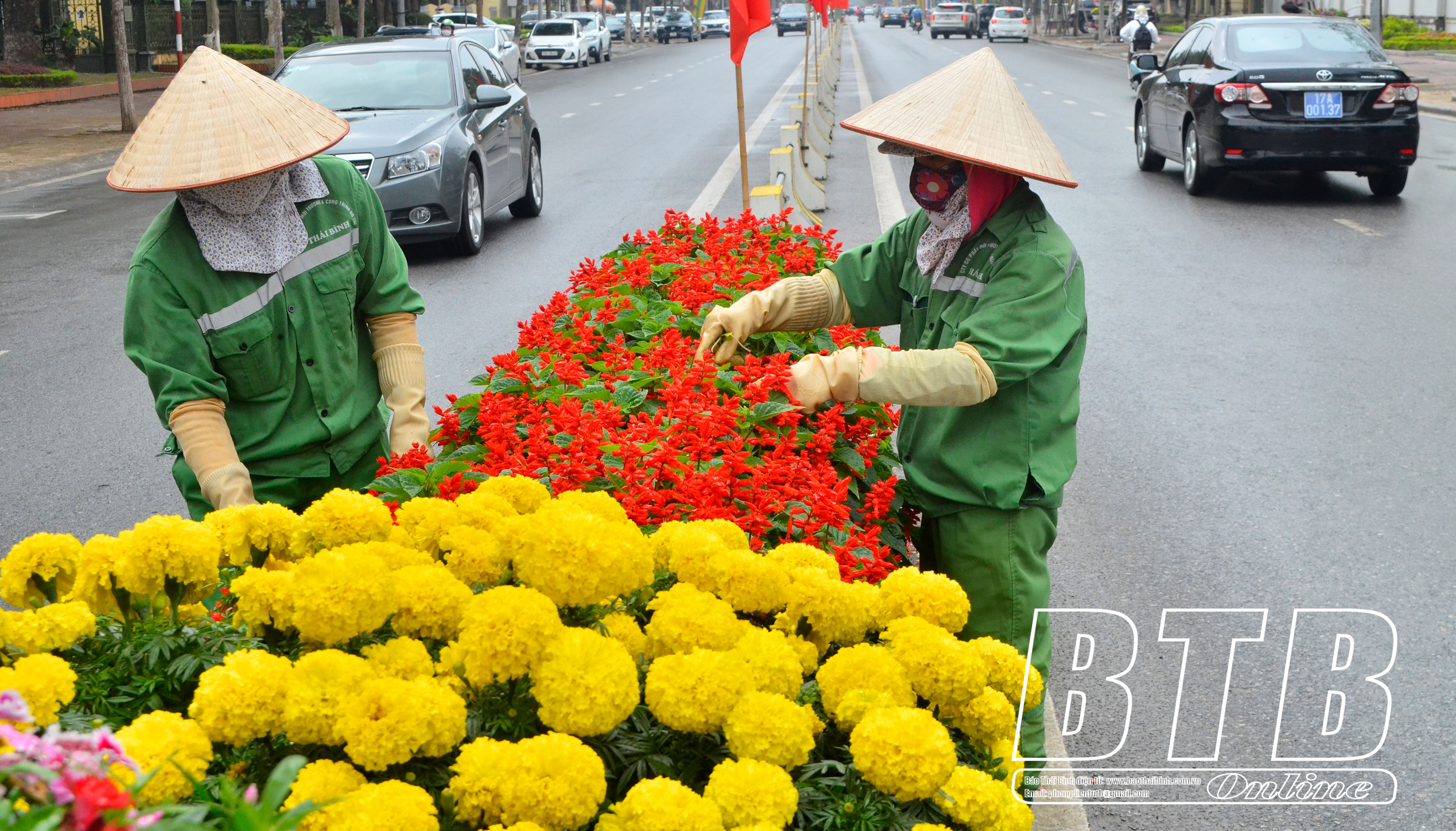 Công nhân Công ty Cổ phần Môi trường và Công trình đô thị Thái Bình chăm sóc hoa, làm đẹp cảnh quan thành phố.