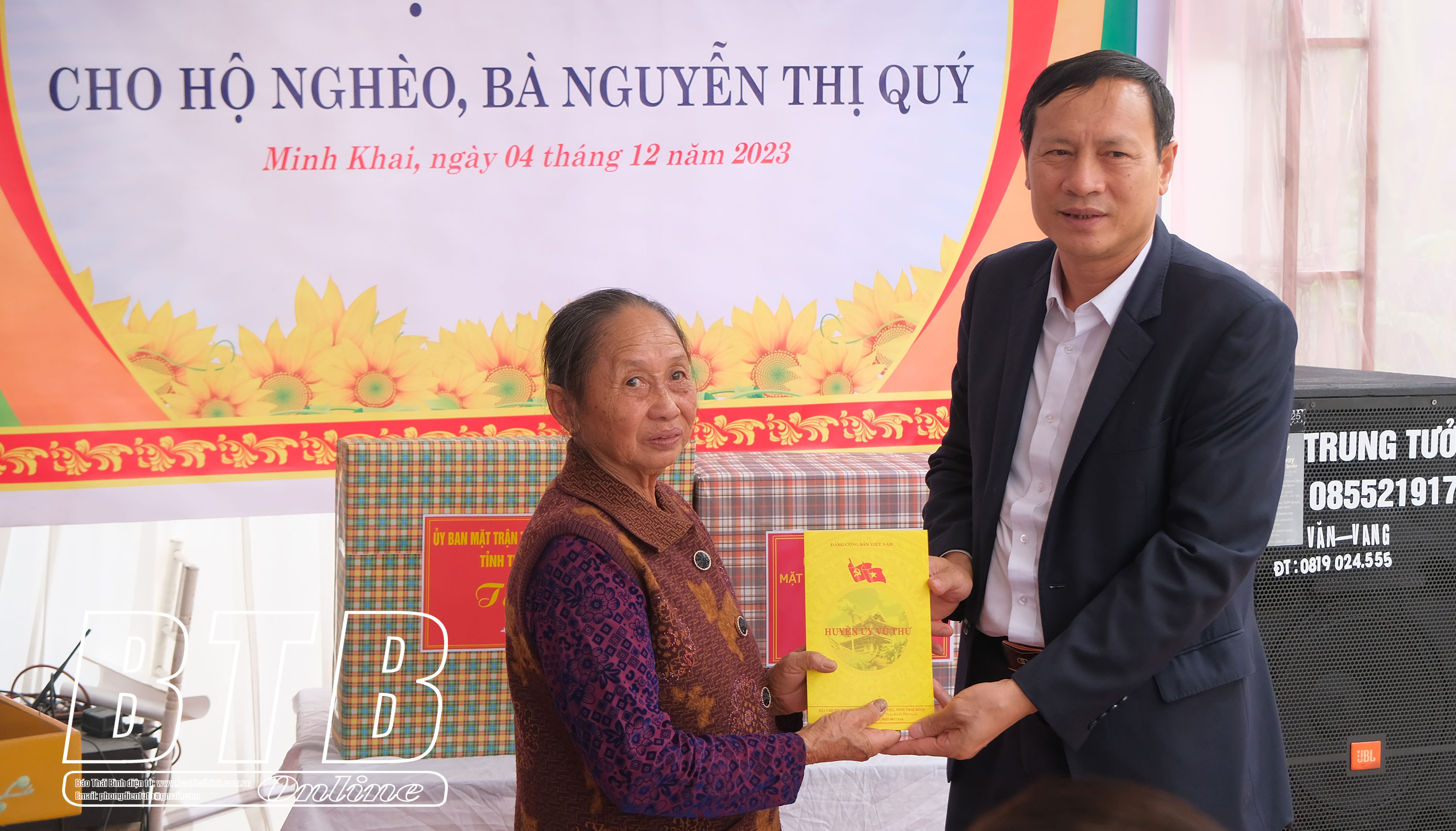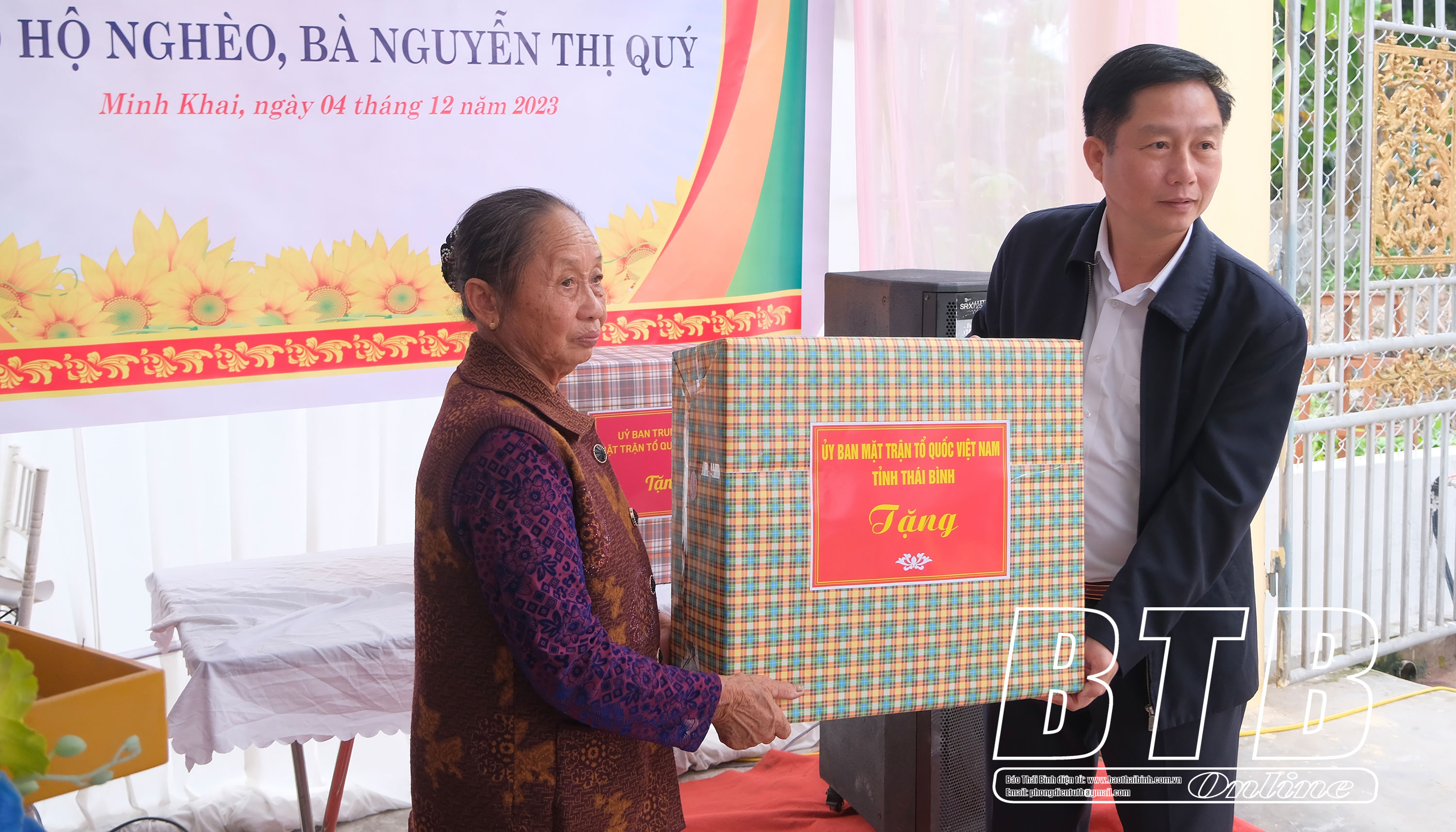 Nhân dịp này, đồng chí Phó Chủ tịch Ủy ban Trung ương MTTQ Việt Nam cùng các các ban, ngành, đoàn thể huyện Vũ Thư, xã Minh Khai đã tặng quà động viên bà Quý tiếp tục nỗ lực vươn lên ổn định cuộc sống.