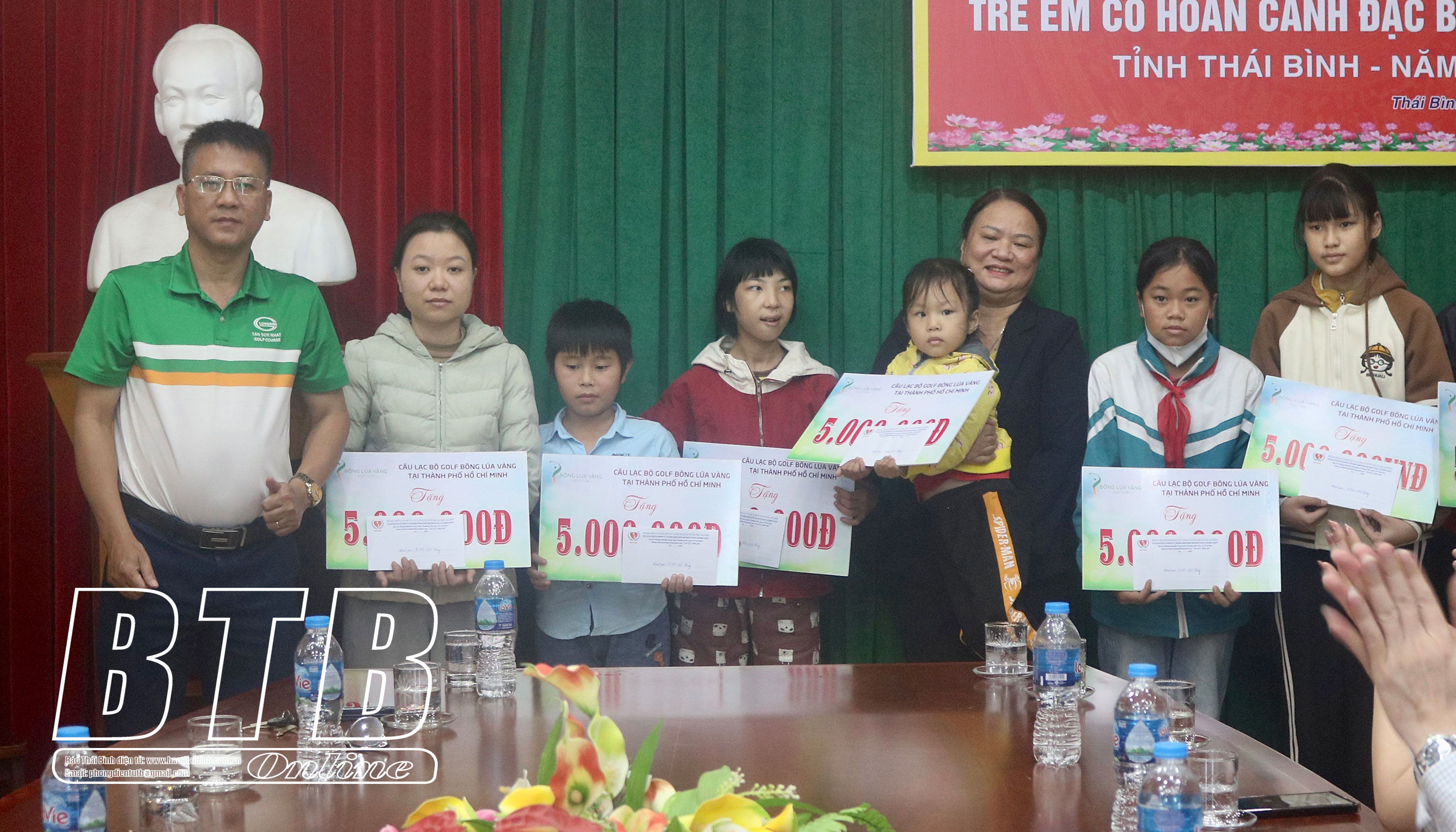 Lãnh đạo Báo Thái Bình, đại diện Câu lạc bộ Golf Bông Lúa Vàng tại Thành phố Hồ Chí Minh trao quà cho người khuyết tật, trẻ mồ côi.