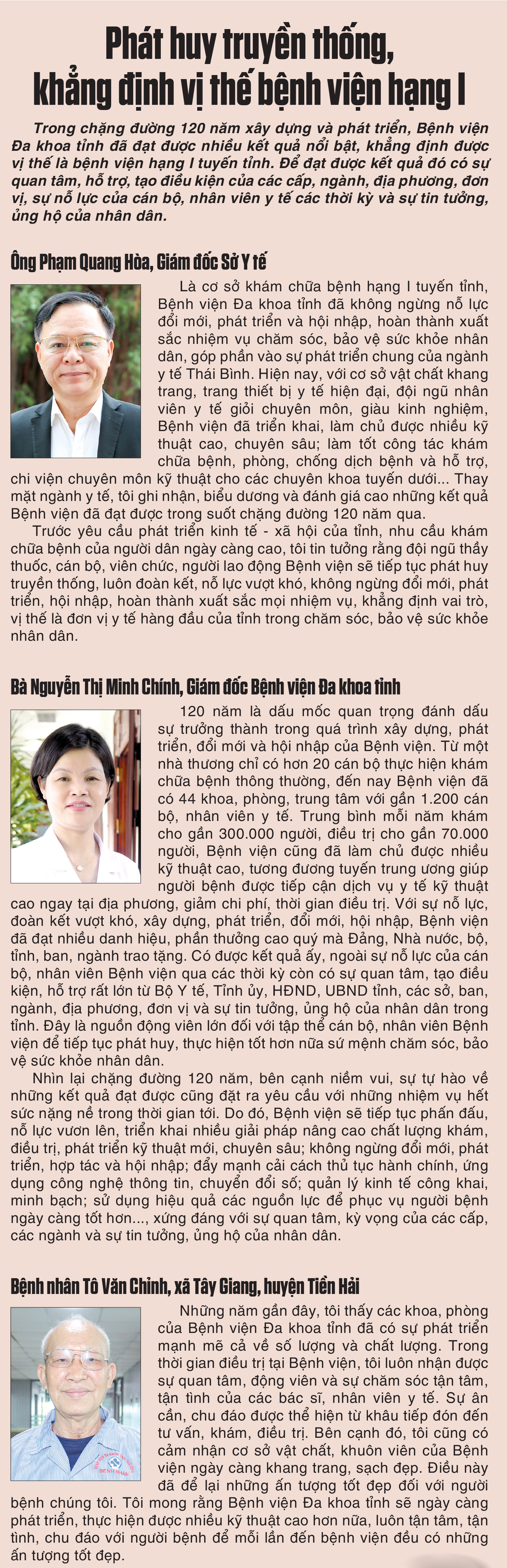 Lật giở từng trang lịch sử Bệnh viện Đa khoa tỉnh mới thấy được sự phát triển của Bệnh viện luôn gắn liền với dòng chảy của tỉnh và lịch sử của dân tộc. Khi mới đi vào hoạt động, Nhà thương Thái Bình chỉ có hơn 20 bác sĩ, nhân viên y tế với 127 giường bệnh, cơ sở vật chất, trang thiết bị nghèo nàn, lạc hậu. Trong các cuộc kháng chiến, phải di tán liên tục đến nhiều nơi, có lúc chuyển thành trạm phẫu thuật, cứu thương lưu động nhỏ gọn dễ cơ động phù hợp với thực tiễn; có lúc nhân lực y tế mỏng, trang thiết bị thiếu thốn, lạc hậu. Thế nhưng, dù trong mọi hoàn cảnh, cán bộ, nhân viên y tế vẫn không ngừng nỗ lực, quyết tâm vượt khó thực hiện tốt công tác khám chữa bệnh, hoàn thành sứ mệnh của người thầy thuốc. Nơi nào có người bệnh, nơi ấy có bác sĩ, không chỉ chữa bệnh tại bệnh viện, các bác sĩ, nhân viên y tế còn có mặt ở những chiến trường ác liệt cấp cứu, điều trị cho người bệnh, góp phần làm nên thắng lợi trong các cuộc kháng chiến cứu nước, giải phóng quê hương. Sau khi đất nước được giải phóng, bước vào thời kỳ đổi mới, với sứ mệnh cao cả, Bệnh viện vừa làm tròn nhiệm vụ khám chữa bệnh vừa là địa chỉ đào tạo, thực hành của các trường đại học, cao đẳng y trên địa bàn.