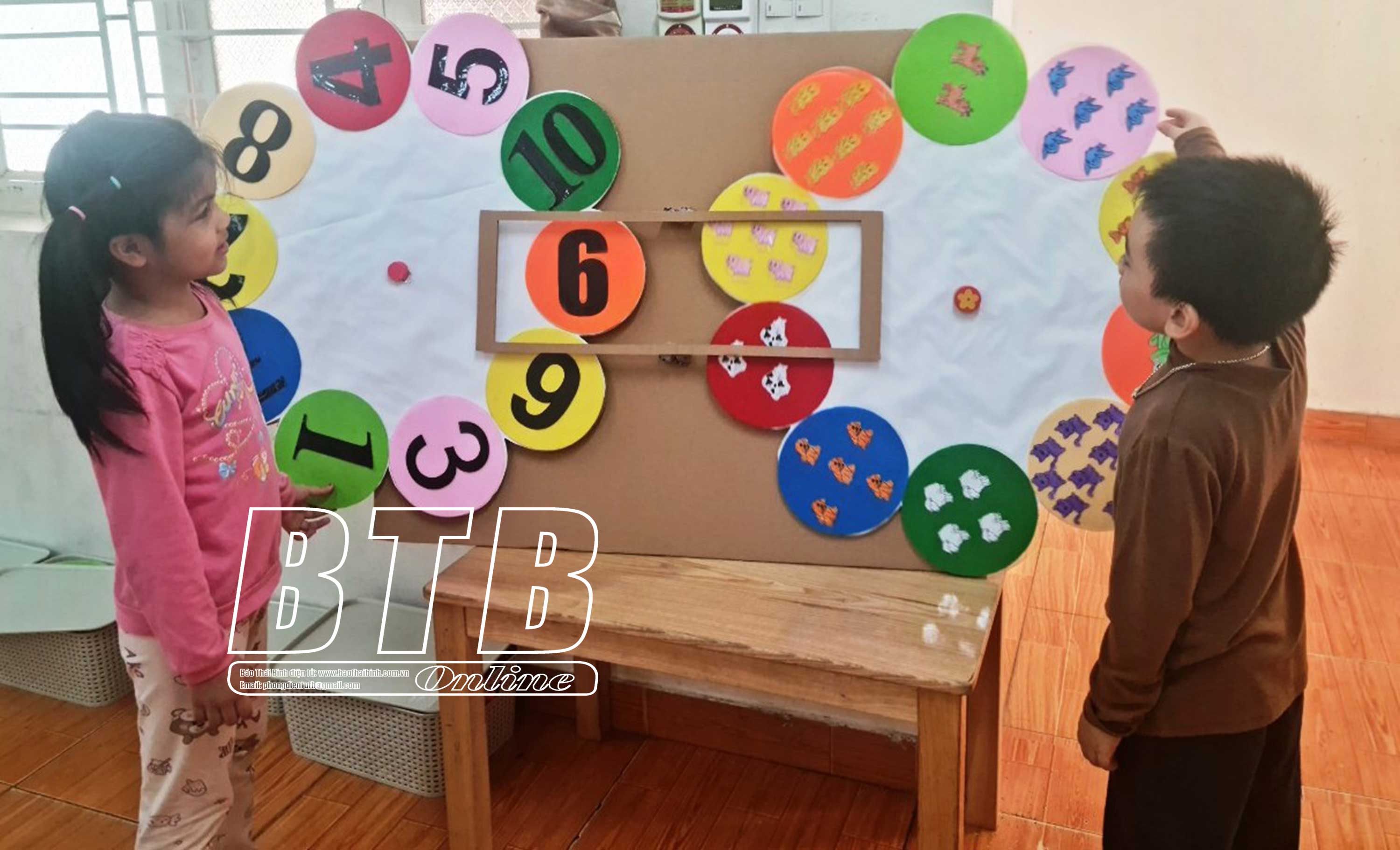 Học sinh Trường Mầm non tư thục Hồng Nhung (thành phố Thái Bình) thích thú với đồ dùng học tập "vòng quay kỳ diệu" do các cô giáo tự làm từ bìa carton.