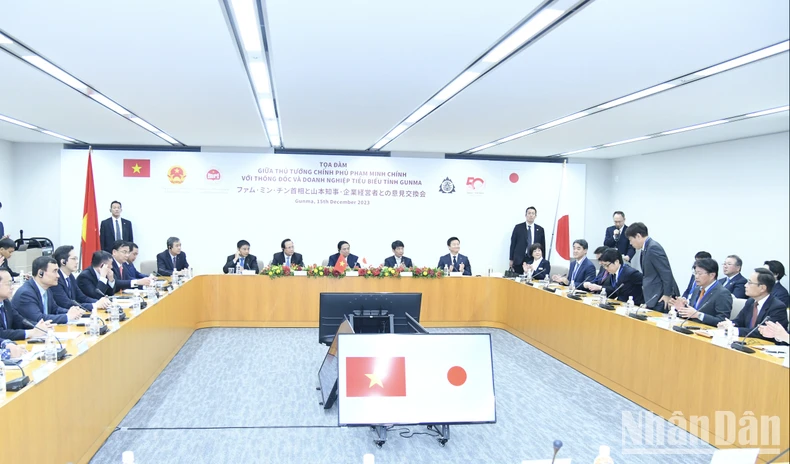 Quang cảnh buổi tọa đàm giữa Thủ tướng Phạm Minh Chính với Thống đốc và các doanh nghiệp tiêu biểu tỉnh Gunma.