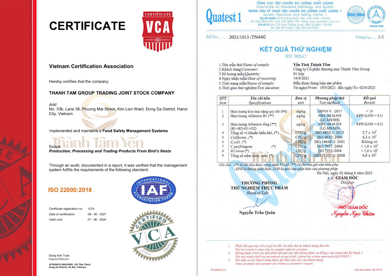 Kết quả kiểm định sản phẩm tại Thành Tâm Yến
