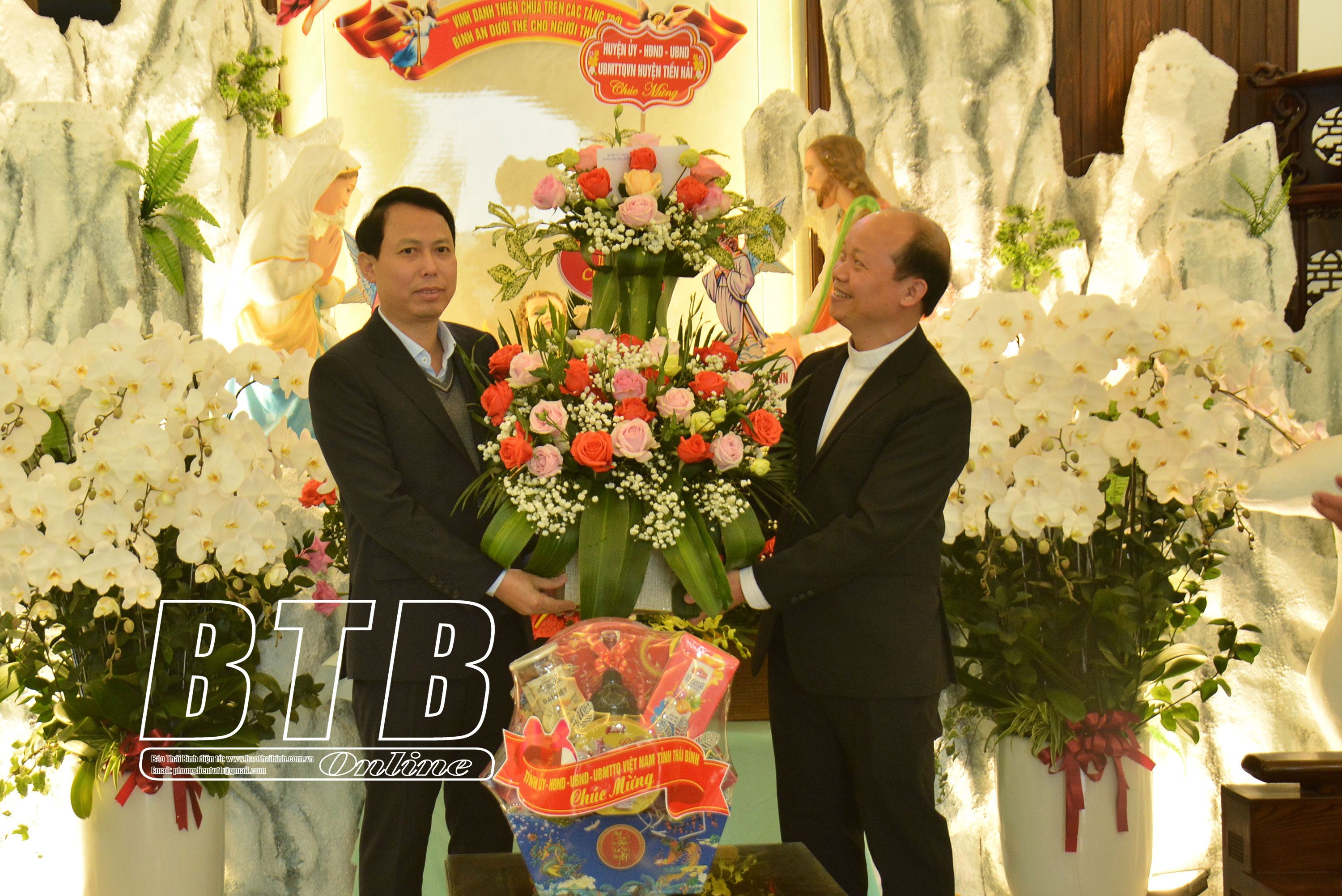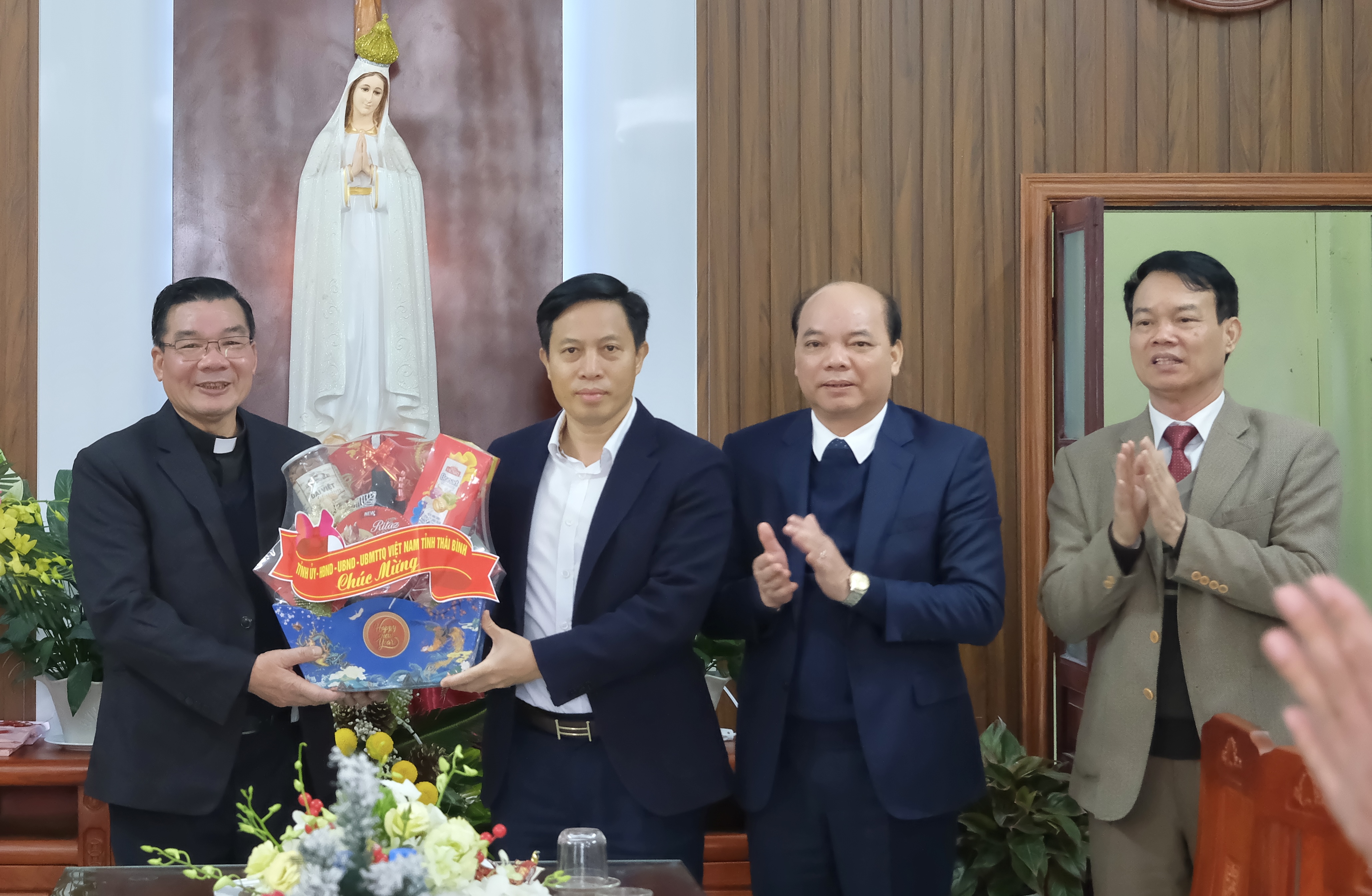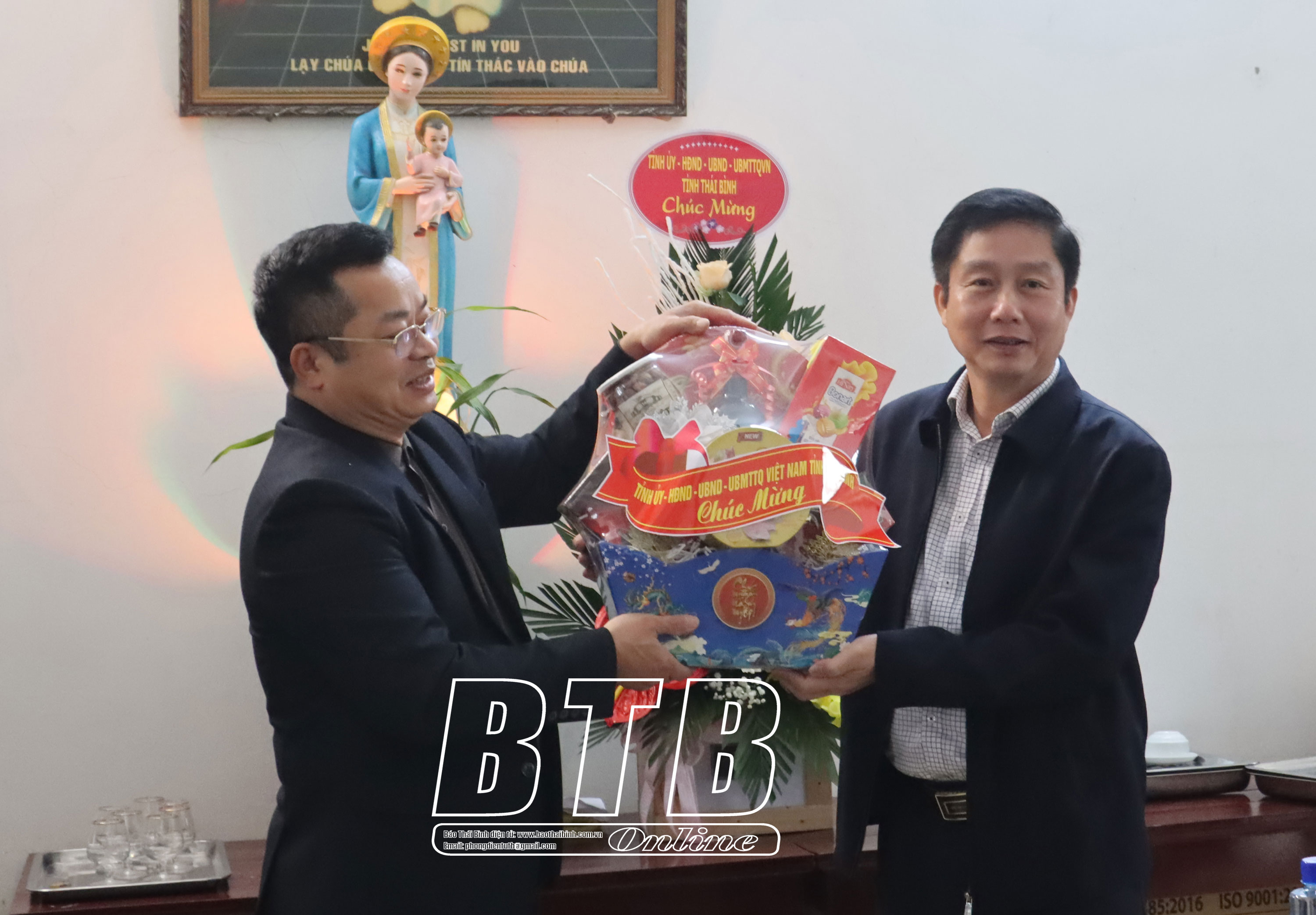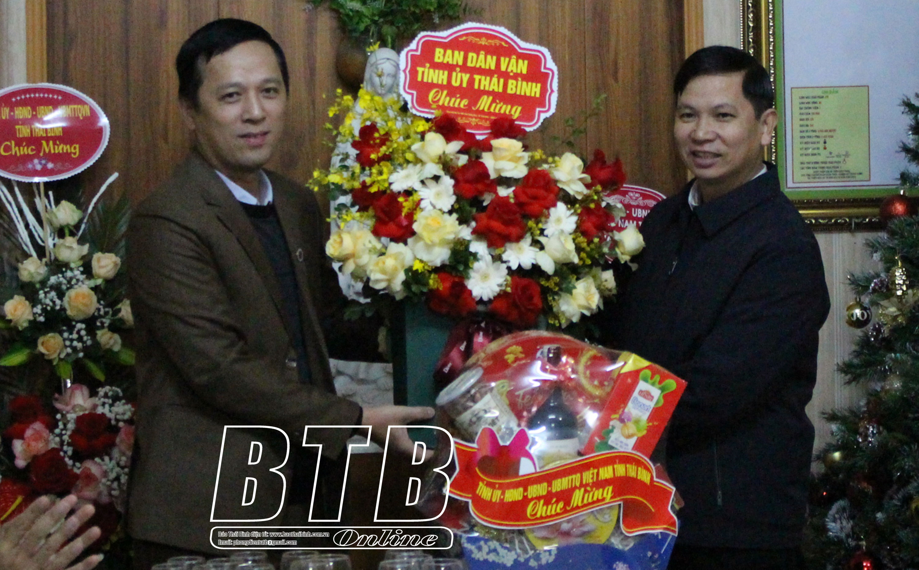 Đồng chí Phó Chủ tịch thường trực UBND tỉnh cùng các thành viên trong đoàn đã tặng hoa, tặng quà Linh mục Phạm Công Dũng, Hạt trưởng Hạt Thái Thụy, Chánh xứ Giáo xứ Thượng Phúc, xã Thụy Sơn và Linh mục Nguyễn Văn Kha, Chánh xứ Giáo xứ Vạn Đồn, xã Hồng Dũng; chúc mừng các chức sắc và đồng bào Công giáo trên địa bàn huyện đón một mùa Giáng sinh an lành, hạnh phúc.