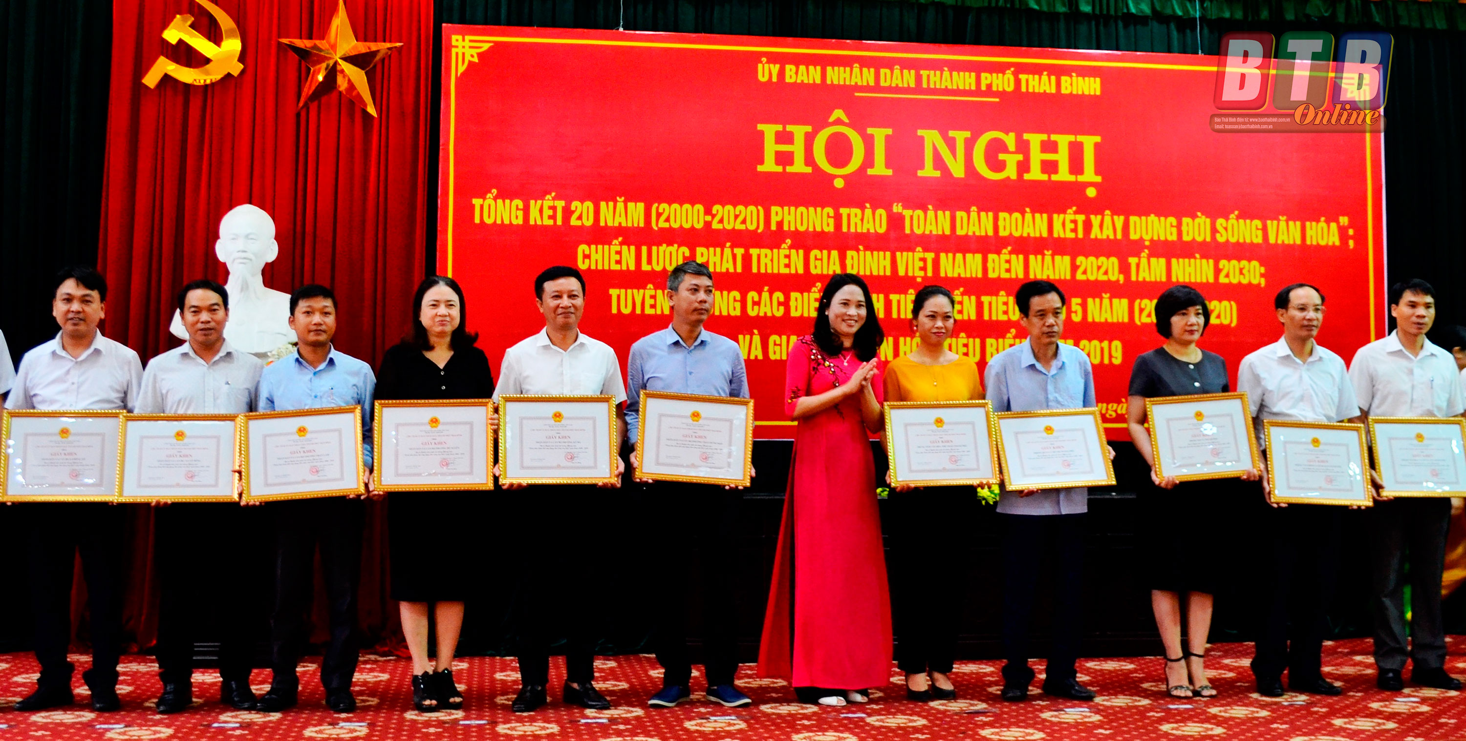 Tại hội nghị, UBND thành phố đã khen thưởng cho 32 tập thể, 9 cá nhân có thành tích tiêu biểu trong phong trào thi đua yêu nước giai đoạn 2015 - 2020; 38 gia đình văn hóa tiêu biểu năm 2019; 15 tập thể, 17 cá nhân có thành tích tiêu biểu trong phong trào “Toàn dân đoàn kết xây dựng đời sống văn hóa”.