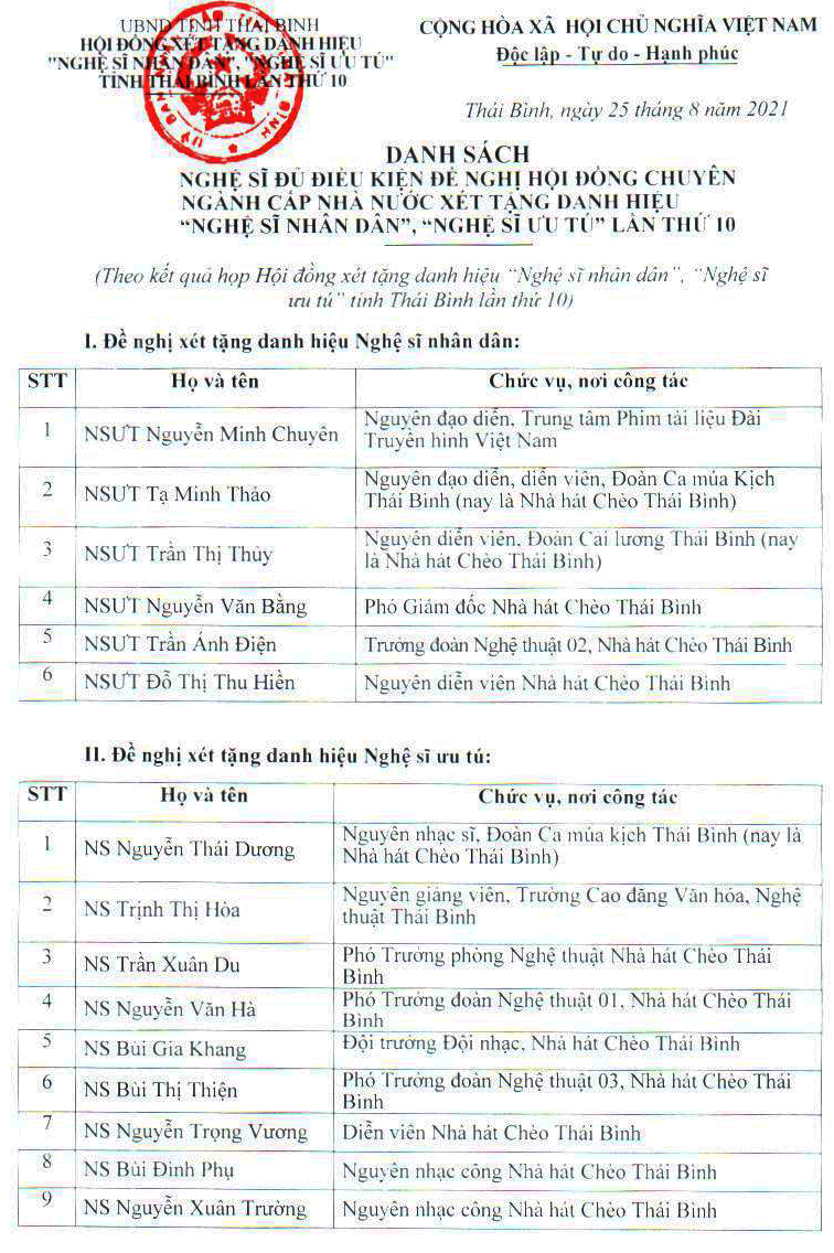 Danh sách nghệ sĩ đủ điều kiện đề nghị Hội đồng chuyên ngành cấp nhà nước xét tặng danh hiệu "Nghệ sĩ nhân dân", "Nghệ sĩ ưu tú" lần thứ 10