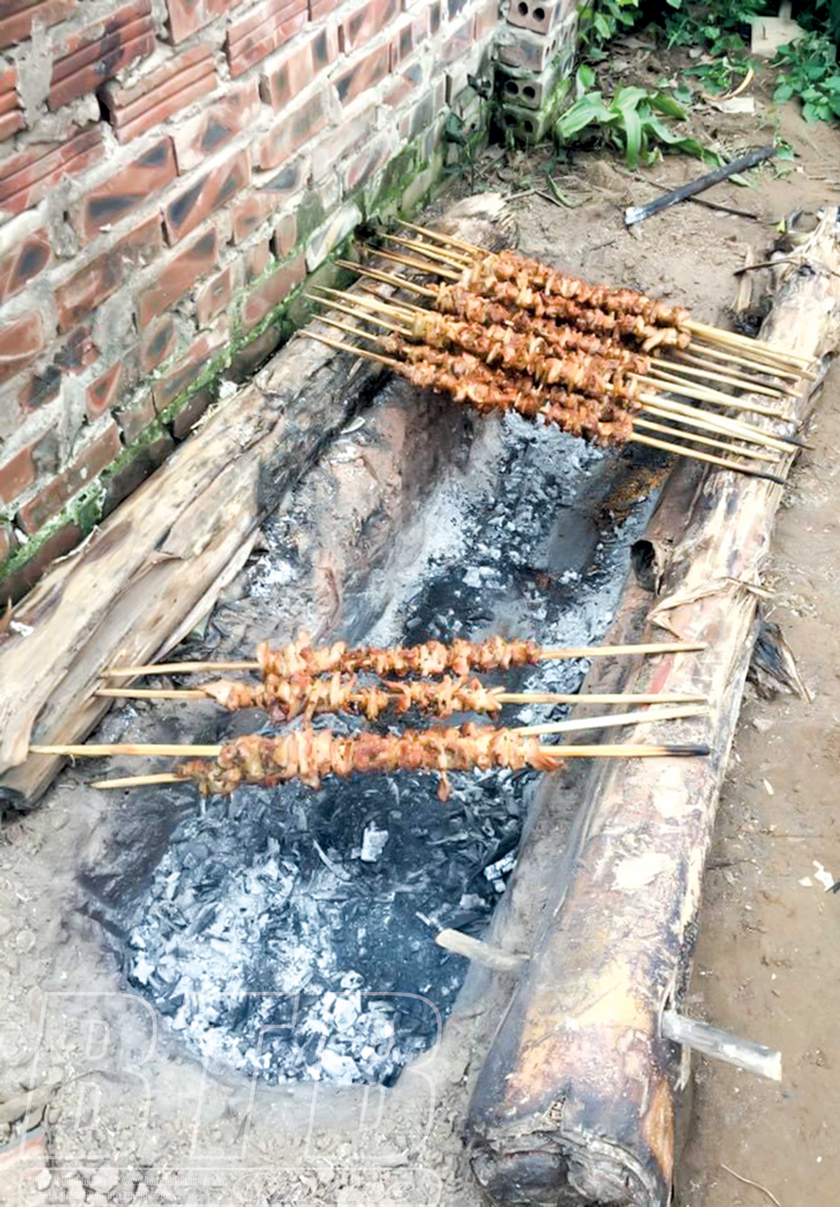 Cỗ cưới ở miền Bắc về cơ bản giống nhau, tuy vậy có một số món có hương vị đặc trưng riêng của vùng quê. Nói đến cỗ cưới làng tôi thì không thể thiếu được món thịt nướng, còn gọi là “thịt đốt”. Nếu thiếu món này thì không còn gọi là cỗ làng tôi. Thịt được tẩm ướp (riềng, sả, mẻ...) từ ba mươi phút đến một tiếng, xiên bằng que tre tươi, đặc biệt là trước khi nướng phải “đào hố” xuống đất, rồi đốt củi cho than hoa vào hố để nướng. Làm vậy để không bị mất nhiệt, thịt chín đỏ đều không bị cháy, quyện được mùi khói của than củi nên luôn có vị khác biệt. Chẳng biết món này có từ bao giờ nhưng đến nay vẫn không thể thiếu trên mỗi mâm cỗ.