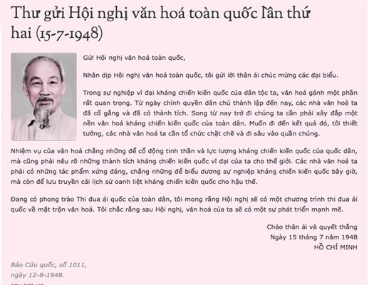 Toàn văn bức thư của Người đã được đọc trân trọng tại lễ khai mạc Hội nghị Văn hóa toàn quốc lần thứ hai vào sáng ngày khai mạc hội nghị, 16/7/1948.