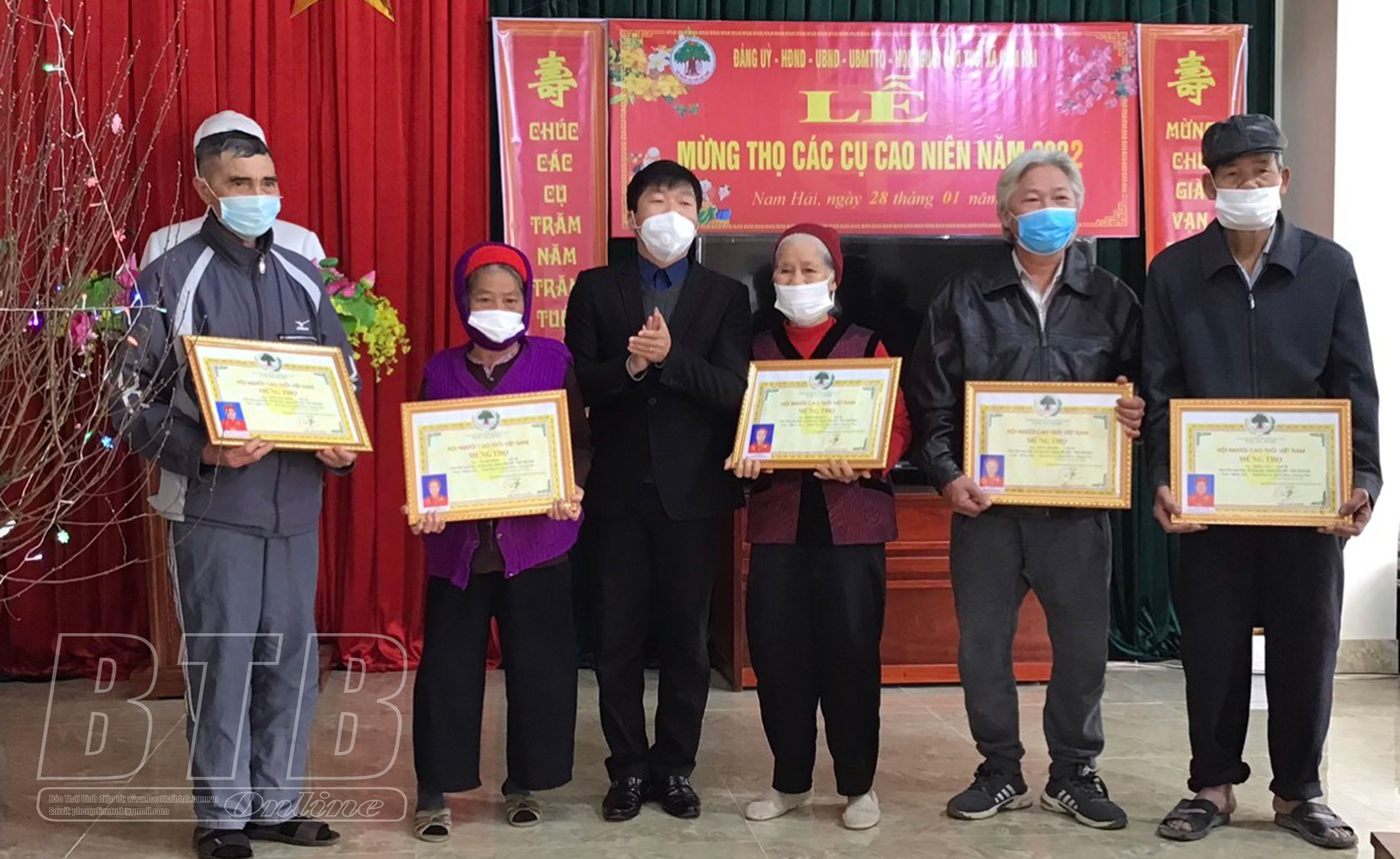Ông Bùi Thanh Lịch, Bí thư Đảng ủy xã Nam Hải cho biết: Để bảo đảm cho công tác phòng, chống dịch Covid-19 trong dịp tết Nguyên đán Nhâm dần 2022, xã đồng loạt tổ chức mừng thọ, chúc thọ đầu năm cho 223 cụ cao niên. Đây là hoạt động mang ý nghĩa nhân văn sâu sắc, được địa phương tổ chức linh hoạt, bảo đảm đầy đủ công tác phòng, chống dịch Covid-19 và thuận tiện cho người dân đi lại nên người dân các thôn đều rất đồng tình ủng hộ. Công tác trang trí khánh tiết cũng được người dân chuẩn bị chu đáo về băng rôn, khẩu trang y tế, nước sát khuẩn tay, máy đo thân nhiệt, cây đào, cây quất, quà, giấy mừng thọ… tạo không khí vui tươi, đầm ấm và an toàn trong phòng, chống dịch Covid-19 ngày đầu xuân.