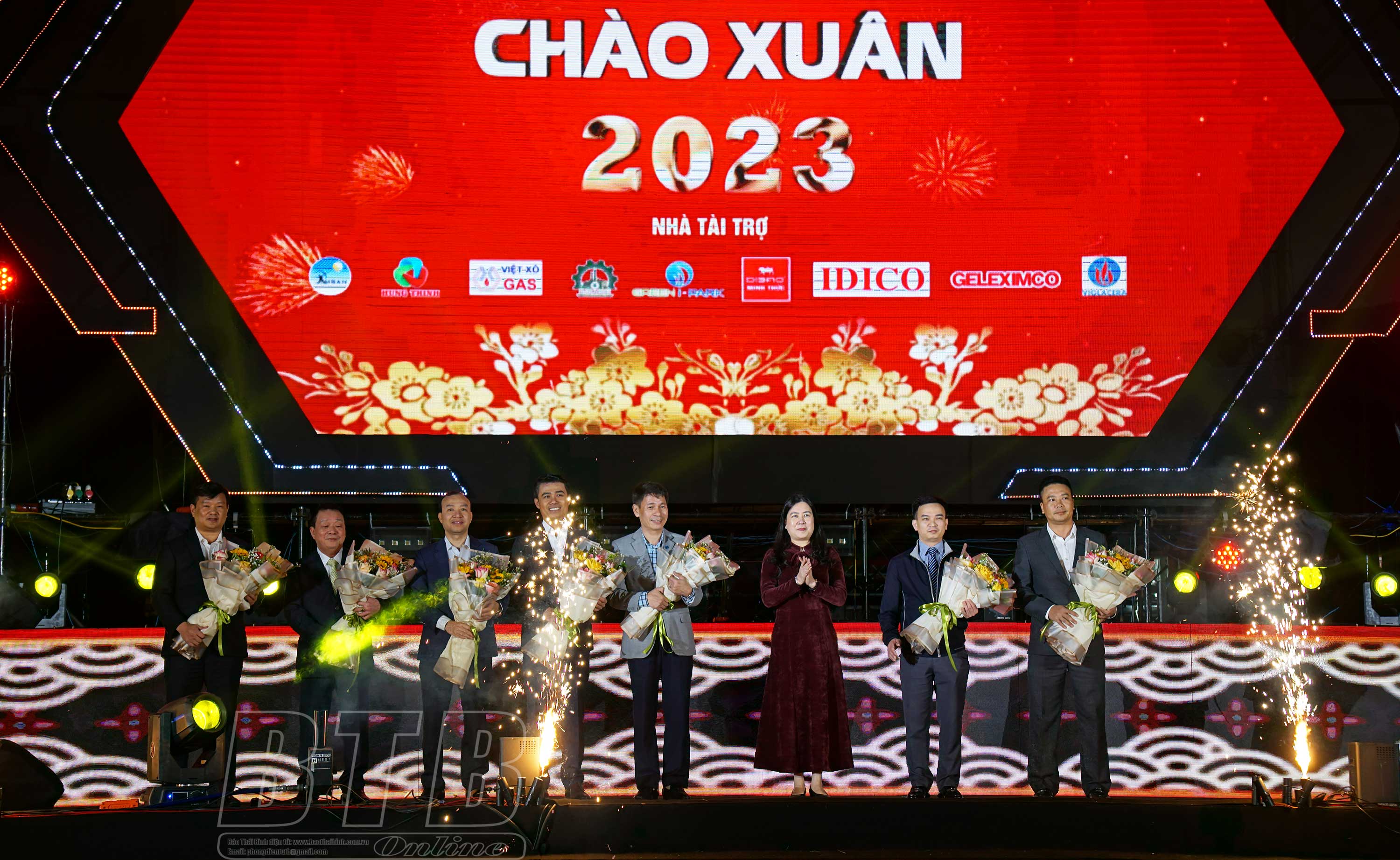 Đồng chí Trần Thị Bích Hằng, Tỉnh ủy viên, Phó Chủ tịch UBND tỉnh tặng hoa, cảm ơn các nhà tài trợ chương trình Đại nhạc hội Chào xuân 2023.
