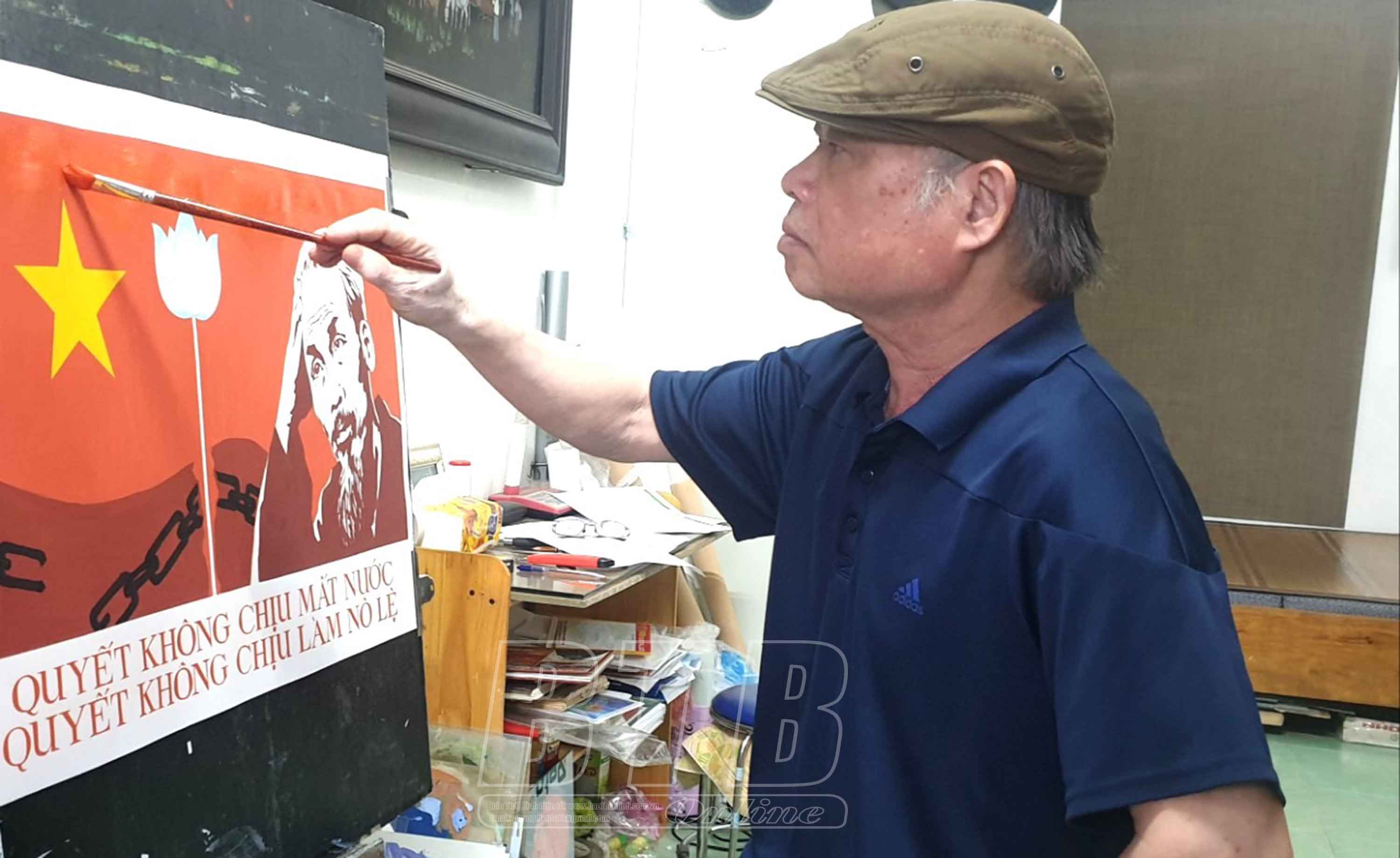 Họa sĩ Đỗ Như Điềm với nhiều bức tranh cổ động được trưng bày, lưu trữ tại Bảo tàng Hồ Chí Minh.