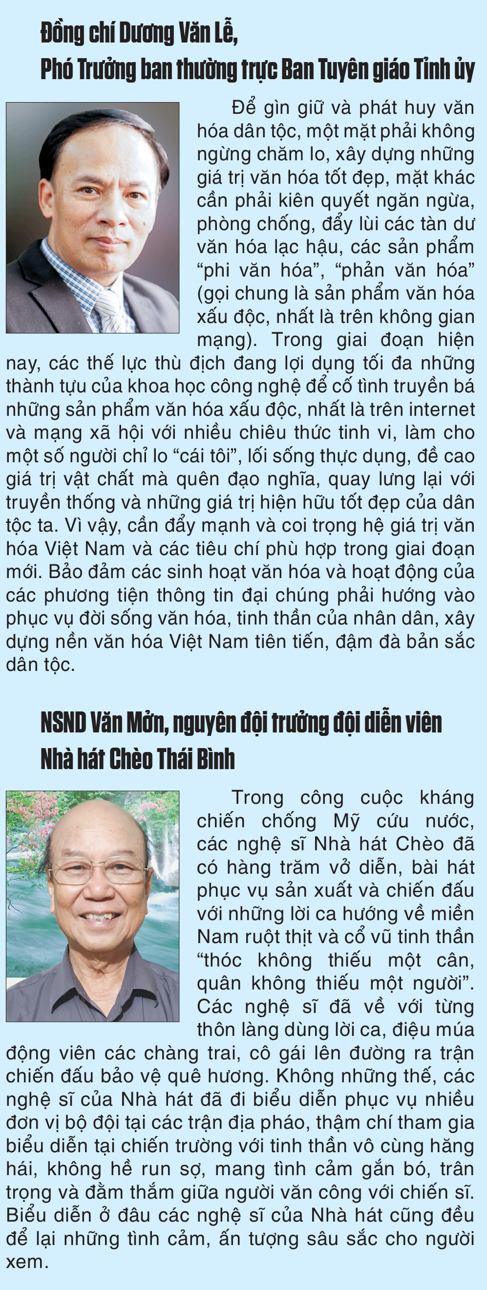 Từ Đề cương về văn hóa Việt Nam năm 1943, nhận thức được vai trò quan trọng của đội ngũ văn nghệ sĩ, trí thức, trong các giai đoạn chiến tranh ác liệt và xây dựng, kiến thiết đất nước, lần lượt các đoàn nghệ thuật chuyên nghiệp như cải lương, chèo, ca múa kịch, Hội Văn học Nghệ thuật, Trường Cao đẳng Văn hóa Nghệ thuật ra đời, đã trở thành những mái nhà chung - nơi tập hợp, định hướng, bồi dưỡng, phát triển đội ngũ văn nghệ sĩ của tỉnh. Bằng tài năng và sự sáng tạo của mình, đội ngũ văn nghệ sĩ thông qua các tác phẩm văn học nghệ thuật đã làm nổi bật lên những vấn đề của thời đại, làm lóe sáng những khát vọng lớn lao, vạch con đường xóa bỏ áp bức, bất công thông qua các hình tượng nghệ thuật đặc sắc, thôi thúc các tầng lớp nhân dân vươn tới lý tưởng cao đẹp, tiếp cận phương pháp hành động cách mạng. Hình tượng, ngôn từ, giai điệu, hình khối, màu sắc... từ các tác phẩm thơ, văn xuôi, hội họa, nhiếp ảnh, âm nhạc, sân khấu tác động vào tình cảm và cùng tạo nên niềm tin cách mạng trong quần chúng, thôi thúc các tầng lớp nhân dân ngưỡng mộ, học tập và làm theo những hình tượng cách mạng được xây dựng và diễn tả một cách sinh động.