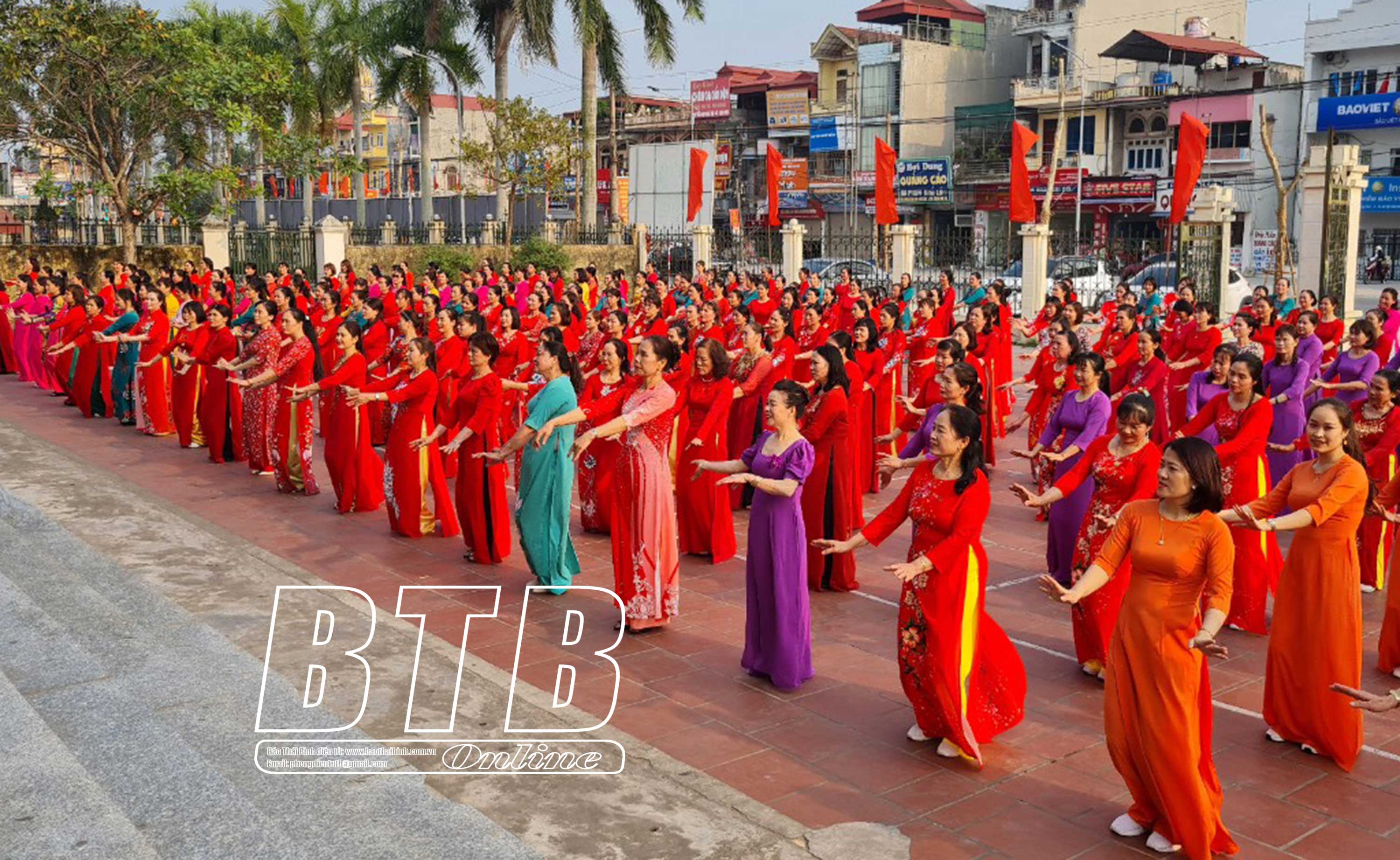 Màn đồng diễn dân vũ của hơn 600 chị em đến từ các câu lạc bộ (CLB) dân vũ và khiêu vũ trong và ngoài huyện Đông Hưng tại sân nhà văn hóa huyện đầu tháng 3 vừa qua đã lan tỏa tinh thần tập luyện dân vũ tới tất cả phụ nữ trong huyện.