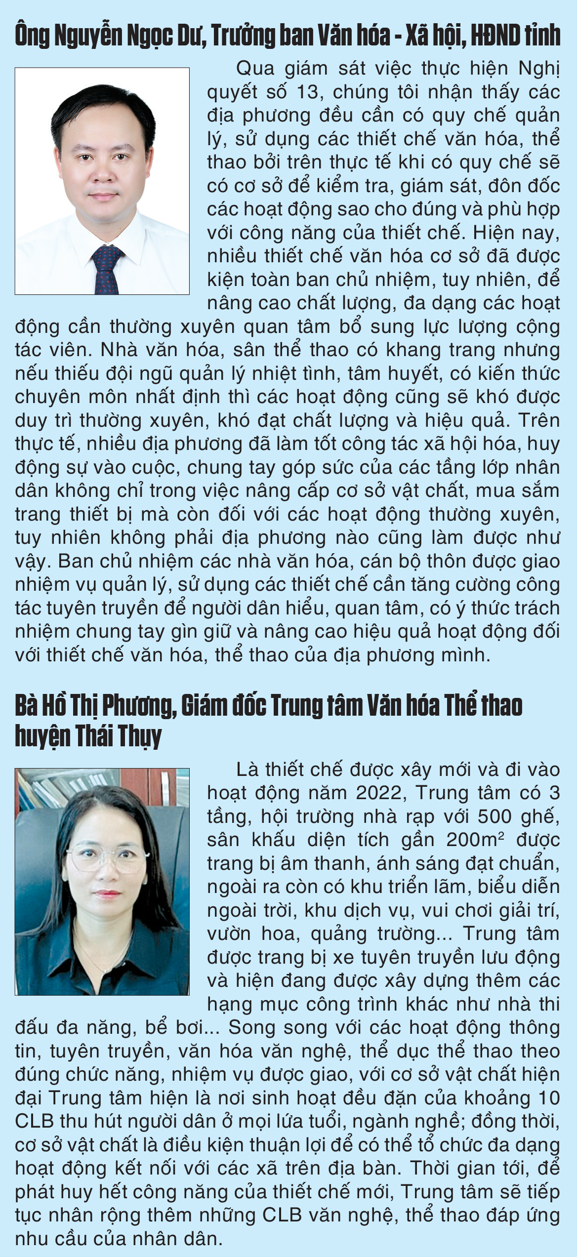 Như vậy, hoàn thiện hệ thống thiết chế văn hóa, thể thao đã khó nhưng nâng cao hiệu quả hoạt động, để các thiết chế thực sự gắn bó với đời sống của người dân còn là công việc đòi hỏi tâm huyết và sự bền bỉ nhiều hơn. Nghị quyết số 13 đã tạo tiền đề quan trọng để người dân có cơ hội được thụ hưởng đời sống văn hóa tinh thần, có không gian tập luyện thể thao, nâng cao sức khỏe ngay tại khu dân cư. Vấn đề là sự vào cuộc quyết tâm hơn nữa từ các cấp chính quyền, vai trò chủ động của mỗi người dân bởi khi cả cộng đồng cùng chung tay gắng sức, mỗi thiết chế sẽ thực sự trở thành tài sản giá trị về cả vật chất và tinh thần, từ đó có sức sống lâu bền hơn.