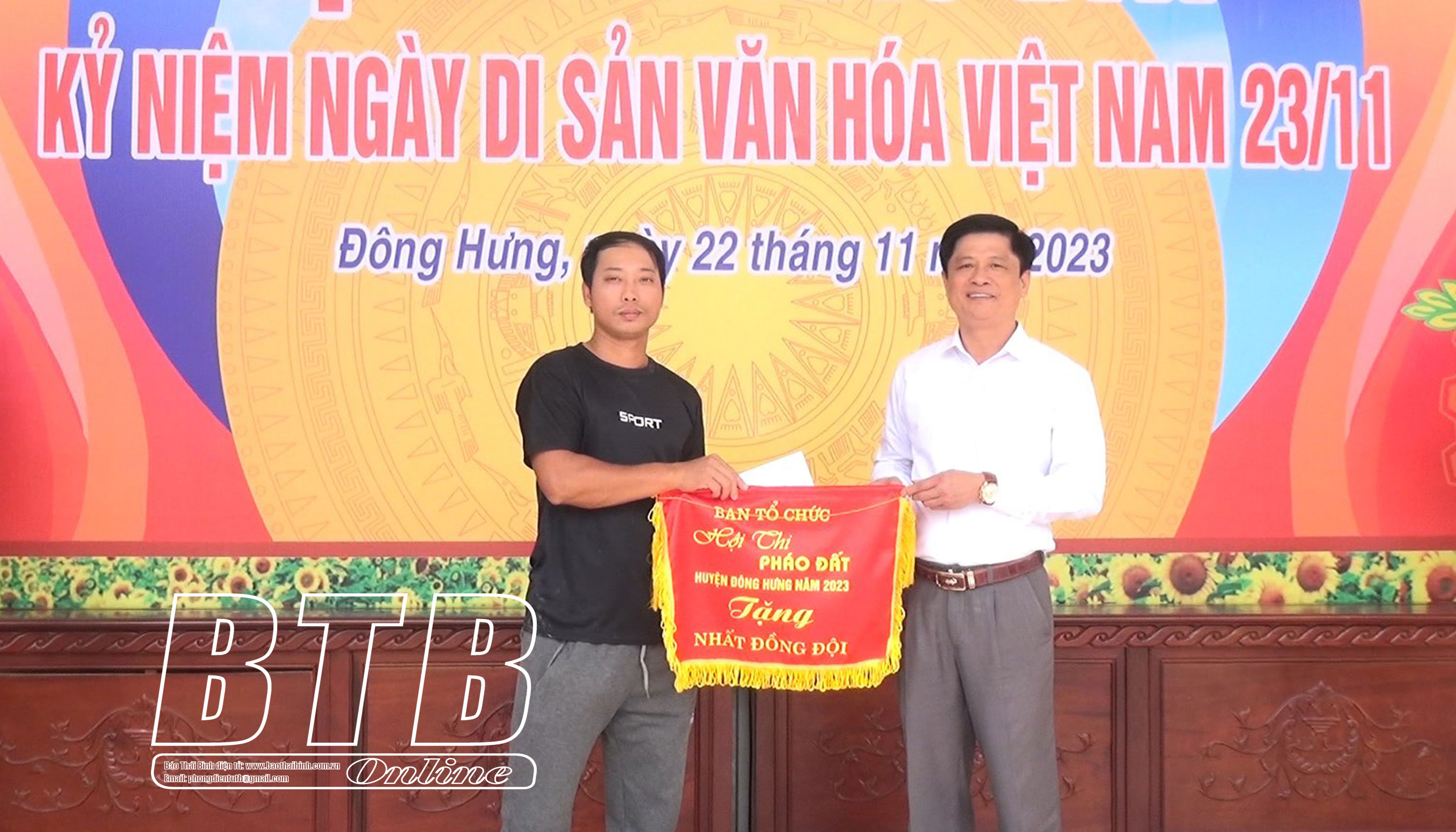Lãnh đạo huyện Đông Hưng trao giải nhất pháo nồi cho đội thi xã Đông Cường.