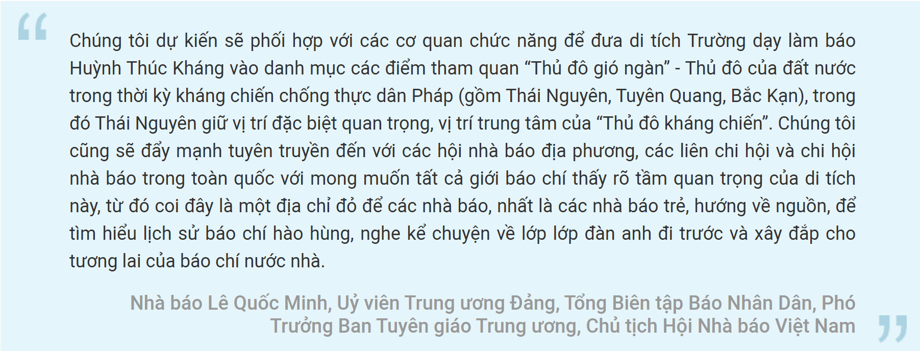 Hội Nhà báo Việt Nam và tỉnh Thái Nguyên mong muốn khai thác và phát huy hiệu quả những giá trị lịch sử to lớn của Di tích, bổ sung thêm một điểm đến ý nghĩa trên bản đồ báo chí Việt Nam đương đại, đáp ứng mong mỏi của các thế hệ người làm báo cả nước, hấp dẫn công chúng trong và ngoài nước, góp phần tích cực vào công tác tuyên truyền, giáo dục lịch sử đối với thế hệ trẻ.