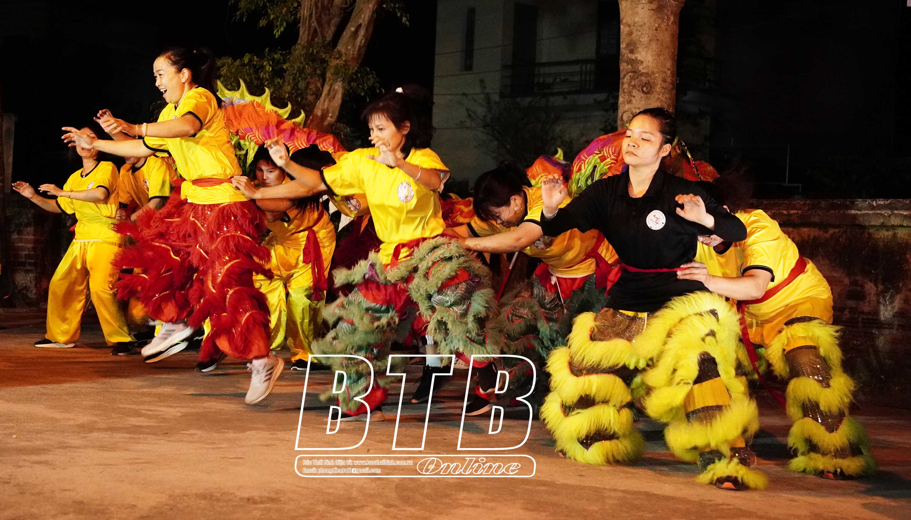 Trong tiết rét ngọt của những ngày cuối năm, tôi tìm về xã Hồng Bạch, nơi có đội múa lân sư rồng là nữ duy nhất của huyện Đông Hưng theo lời giới thiệu của người dân địa phương. Đúng 8 giờ tối, trên khoảng sân rộng của nhà văn hóa, các thành viên hăng say tập luyện. Bà Đặng Thị Thìn, Chi hội trưởng Chi hội Phụ nữ thôn Hậu Trung II là người khởi xướng kêu gọi chị em phụ nữ trong thôn tham gia đội múa lân.