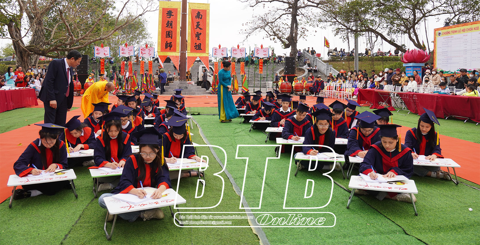 Trong khuôn khổ chương trình, CLB Thư pháp Hán Nôm huyện Quỳnh Phụ biểu diễn viết chữ thư pháp và trao tặng chữ cho các đại biểu, học sinh và du khách tại lễ hội.