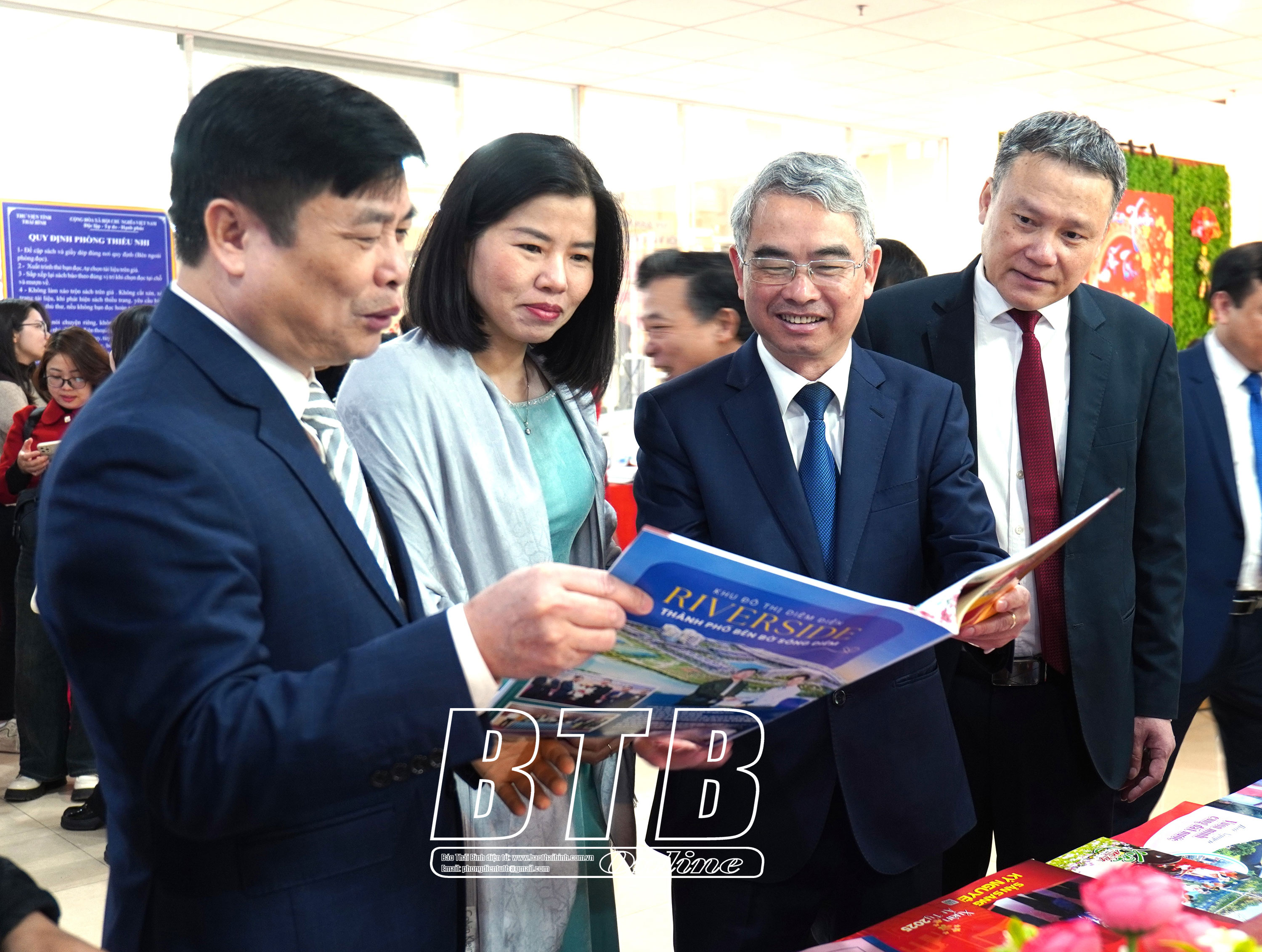 Các đồng chí: Phạm Đồng Thụy, Ủy viên Ban Thường vụ, Trưởng ban Tuyên giáo Tỉnh ủy; Phạm Văn Nghiêm, Tỉnh ủy viên, Phó Chủ tịch UBND tỉnh xem ấn phẩm Báo Thái Bình.