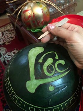 Là sinh viên Trường Đại học Y Dược Thái Bình, em Tưởng lại chọn dưa hấu để khắc chữ thư pháp bày tết. Tuy chỉ mới mày mò tự làm song do khéo tay nên sản phẩm em làm ra cũng khá đẹp mắt. Nhưng vì không có nhiều thời gian, Tưởng chỉ tranh thủ làm cho anh em họ hàng trong gia đình và tặng người quen thân để bày ban thờ ngày tết. Mỗi quả dưa hấu vẽ khắc trong khoảng thời gian gần 2 giờ, song kết quả đã làm thay đổi hoàn toàn về mặt hình thức bên ngoài. Từ trước đến nay, quả dưa được ưa chọn để thờ trong những ngày tết bởi mang ý nghĩa về sự đỏ đắn, may mắn cả năm, nay được khắc làm nổi bật phần chữ xanh nhạt trên phần nền xanh thẫm. Vừa đẹp mắt, vừa giá trị hơn rất nhiều bởi thể hiện được ý muốn mong cầu của từng người qua ý nghĩa của từng con chữ.