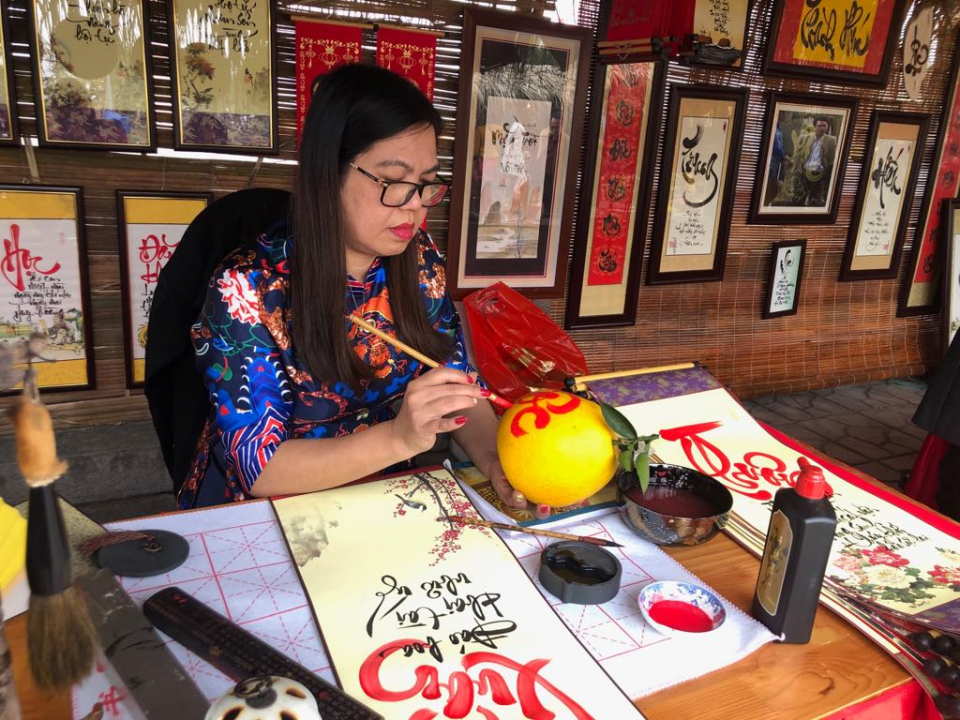 Là người đam mê thư pháp, viết chữ đẹp, chị Hà Thị Thanh Hương, phường Quang Trung, thành phố Thái Bình được nhiều người yêu thư pháp tìm đến đặt chữ viết trên các loại nguyên liệu như giấy, quạt, mẹt tre... Chị Hương cho biết, chuẩn bị tết Nguyên đán Kỷ Hợi năm nay có điểm mới là nhiều người thích viết chữ trên các loại quả thường được chọn để thờ trong những ngày tết. Ngoài cá nhân nhiều người tìm đến chị đặt viết chữ ưa thích, mang nội dung mong ước cho cả năm toại nguyện đã có cả các đại lý đặt hàng chị viết chữ với số lượng nhiều để cung cấp ra thị trường, phục vụ người dân chuẩn bị mâm ngũ quả thờ tết. Các chữ được mọi người ưa chuộng đặt viết thường là chữ Tài, Phúc, Lộc, Khang, An... Có người thích đặt 4 quả 4 chữ để cùng với nhau thành một bộ. Có người chỉ đặt 2 quả hoặc 1 chữ độc lập để bày trong mâm ngũ quả. Tùy số lượng quả, nền màu quả mà chị chọn chữ, chọn màu, cỡ chữ để viết cho phù hợp và nổi bật. Ví dụ quả bưởi màu xanh, chị sẽ chọn màu nâu đậm để viết chữ, quả màu vàng sẽ chọn chữ màu đỏ. Kết quả, quả bưởi đã trở thành 1 tác phẩm nghệ thuật làm hài lòng khách hàng bởi sự nổi bật và hài hòa, ý nghĩa, ai cũng thích thú.