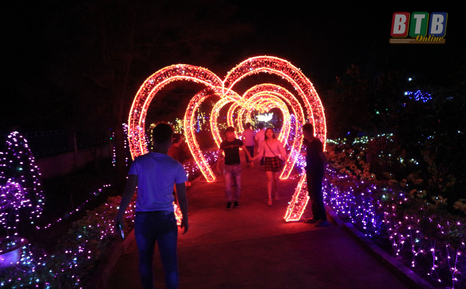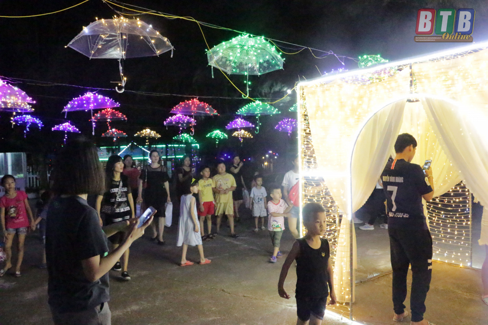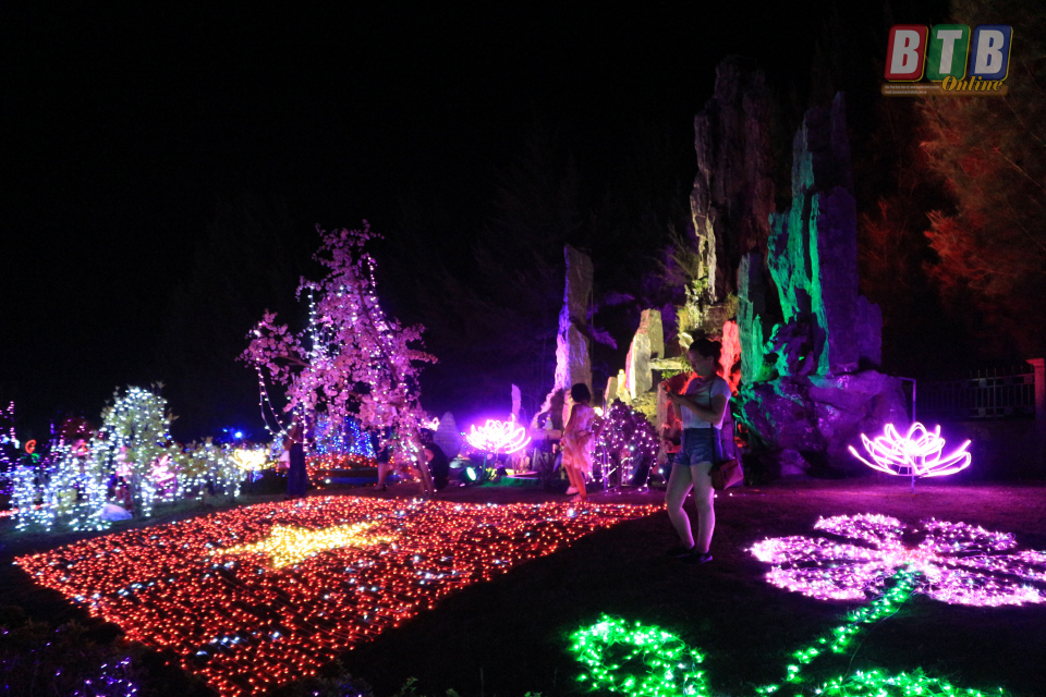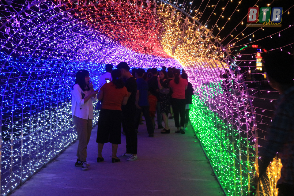 Du khách chụp ảnh lưu niệm tại khu hòa âm ánh sáng tối khai mạc lễ hội 2019. Ảnh:Thanh Thưởng.