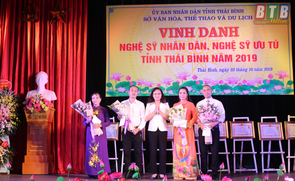 Trong số các nghệ sĩ cả nước được phong tặng danh hiệu NSND, NSƯT tại Hà Nội vào tháng 8 vừa qua, Thái Bình vinh dự có 8 nghệ sĩ được phong tặng danh hiệu gồm: NSND Nguyễn Thị Huyền Phin, NSND Nguyễn Thị Thu Hiền, NSND Vũ Ngọc Cải, NSND Phạm Huy Tầm và NSƯT Nguyễn Thị Thương Huyền, NSƯT Nguyễn Minh Dương, NSƯT Nguyễn Thị Kim Thành, NSƯT Nguyễn Mạnh Tuấn. Đây là phần thưởng cao quý nhất mà Nhà nước dành tặng cho những người hoạt động trong lĩnh vực nghệ thuật.