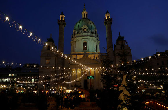 Một chợ Giáng sinh trước cổng Karslkirche ở thủ đô Vienna, Áo.