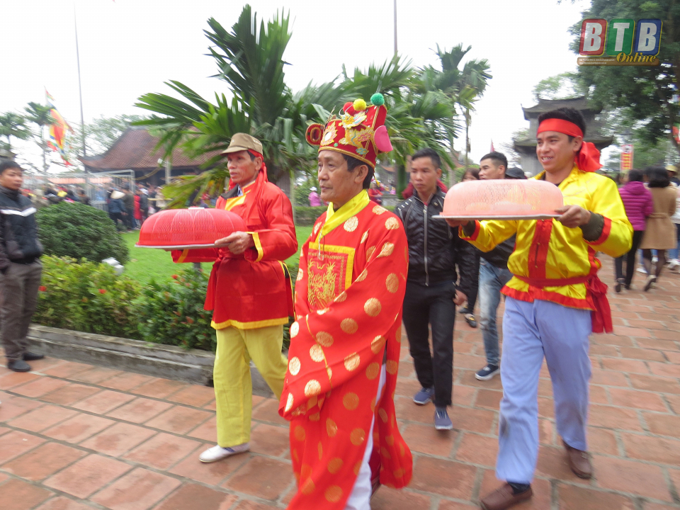 Người dân làng Keo dâng mâm cơm được thực hiện tốt nhất trong hội thi lên Đức Thánh.