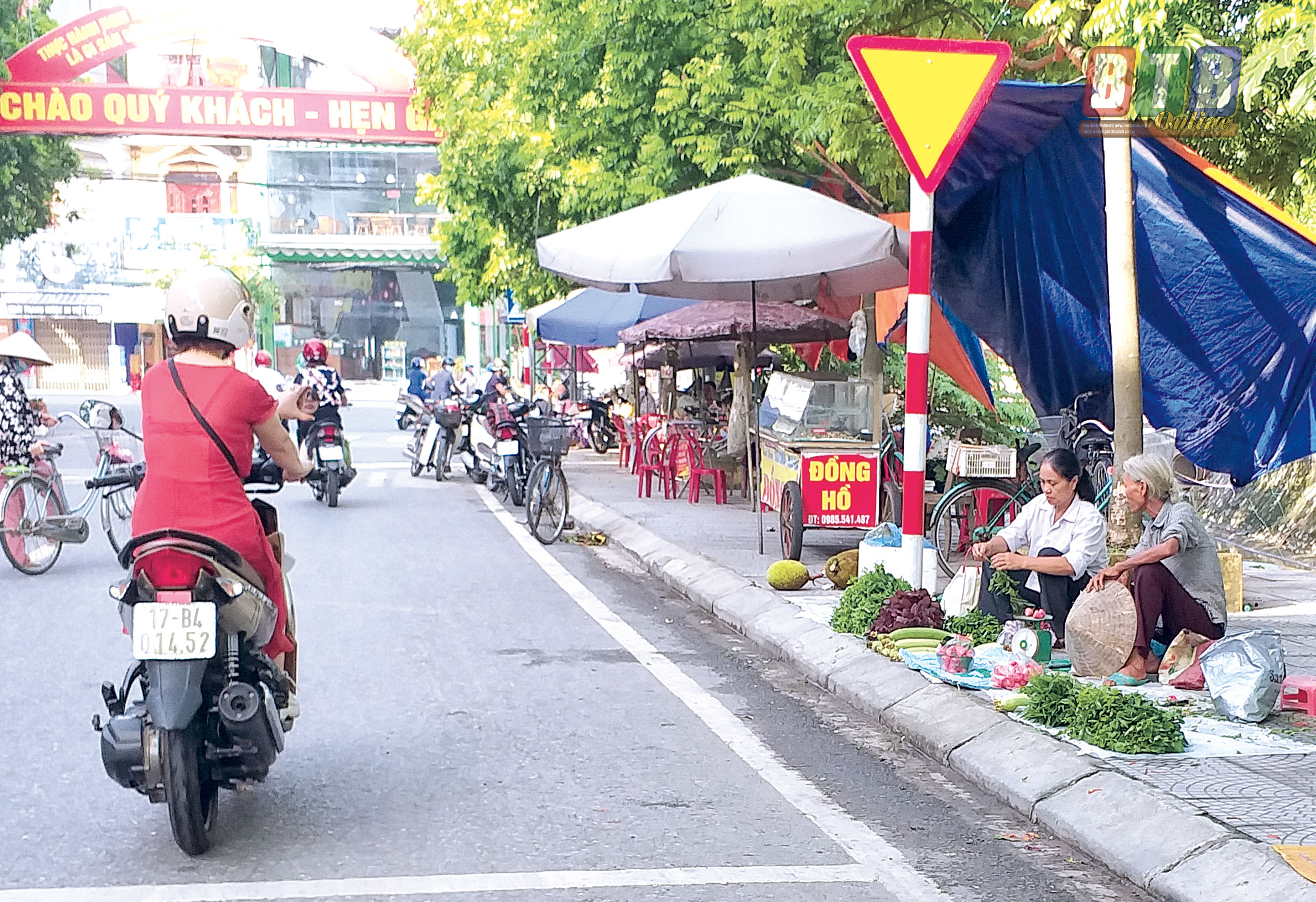 Lấn chiếm vỉa hè và lòng, lề đường bán hàng (ảnh chụp tại đường Vũ Thị Thục Nương, thị trấn Hưng Hà, ngày 2/7/2020).