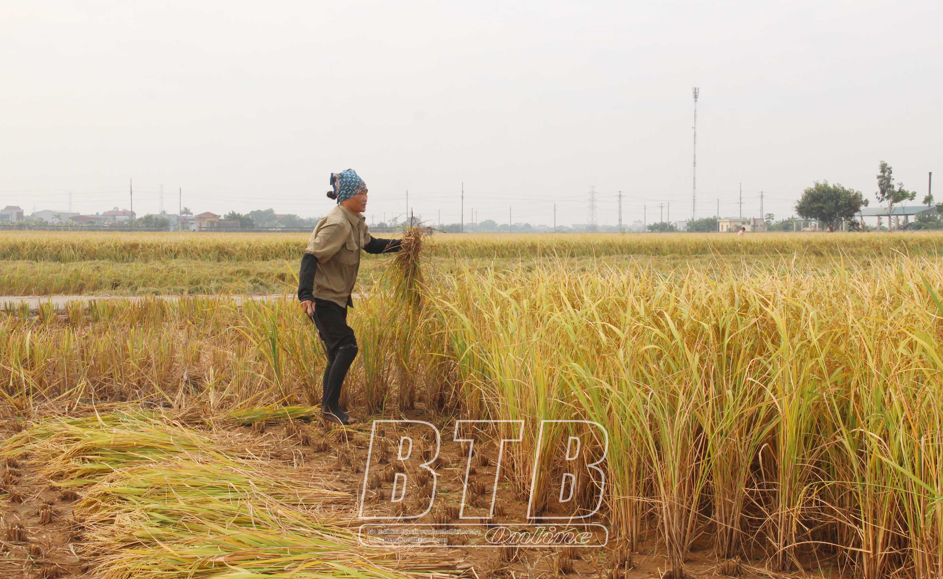 Không đành lòng nhìn thành quả của mình để mưa bão cướp mất, bà con nông dân huyện Đông Hưng xuống đồng thu hoạch những diện tích còn lại. Bên cạnh những chiếc máy gặt hối hả chạy trên ruộng, mỗi người một công đoạn, người nhanh tay gặt, người bó lúa, người chuyển lên xe kịp chở về nhà trước giờ bão nổi.