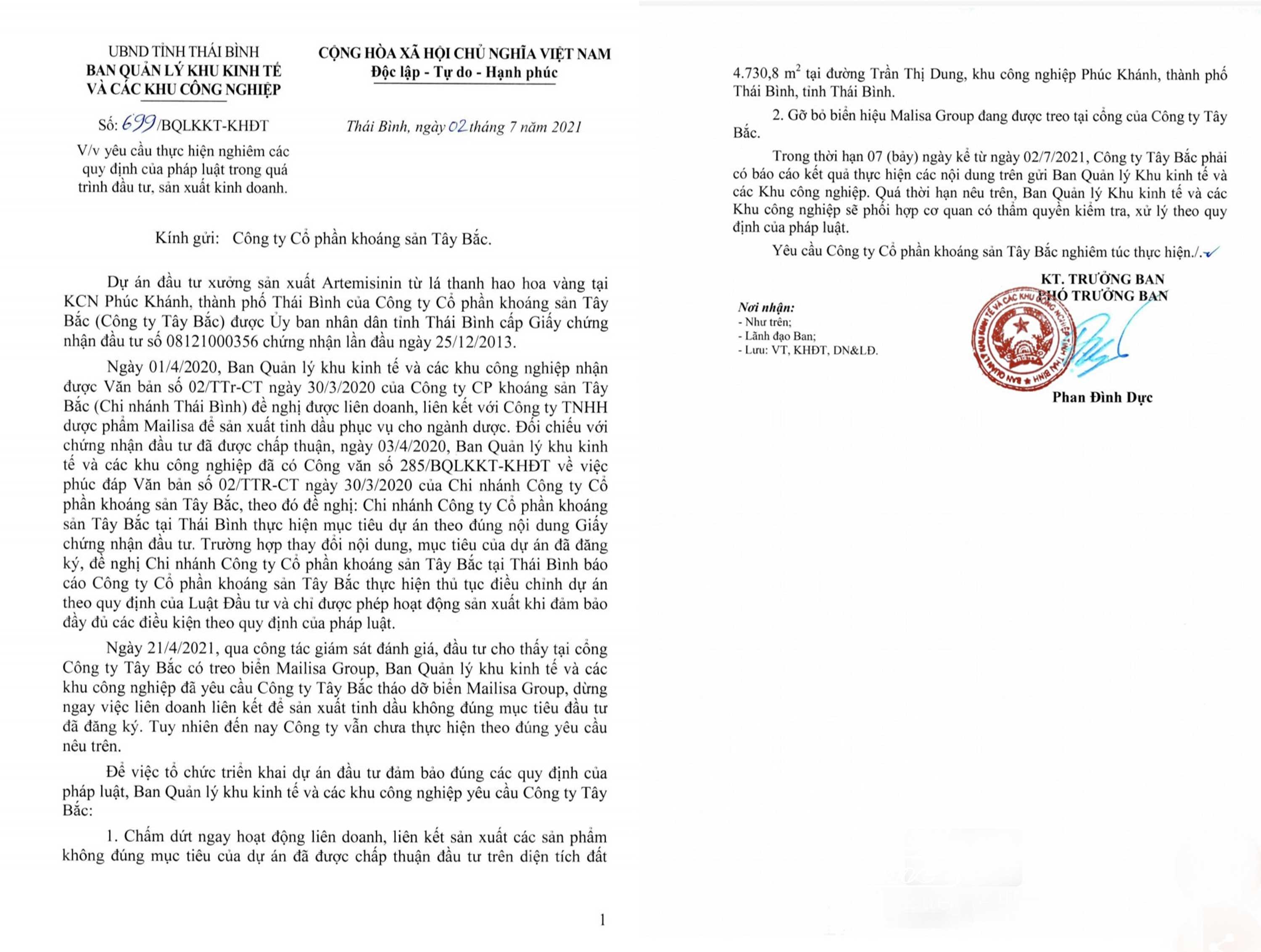 Thế nhưng, từ ngày Đoàn kiểm tra của Ban Quản lý Khu kinh tế và các khu công nghiệp tỉnh có kết luận đến đầu tháng 7/2021 (gần 3 tháng), Công ty Tây Bắc vẫn không thực hiện các nội dung theo yêu cầu. Vì vậy, ngày 2/7/2021, Ban Quản lý Khu kinh tế và các khu công nghiệp tỉnh có Công văn số 699/BQLKKT-KHĐT yêu cầu Công ty Tây Bắc thực hiện nghiêm các quy định của pháp luật trong quá trình đầu tư, sản xuất, kinh doanh. Cụ thể, Ban yêu cầu Công ty Tây Bắc: Chấm dứt ngay hoạt động liên doanh, liên kết sản xuất các sản phẩm không đúng mục tiêu của dự án đã được chấp thuận đầu tư trên diện tích đất 4.730,8m2 tại đường Trần Thị Dung, khu công nghiệp Phúc Khánh, thành phố Thái Bình; gỡ bỏ biển hiệu Mailisa đang được treo tại cổng của Công ty Tây Bắc. Công văn cũng nêu rõ, trong thời hạn 7 ngày kể từ ngày 2/7/2021, Công ty Tây Bắc phải có báo cáo kết quả thực hiện các nội dung mà Ban đã yêu cầu; nếu Công ty không thực hiện, Ban Quản lý Khu kinh tế và các khu công nghiệp tỉnh sẽ phối hợp với cơ quan có thẩm quyền kiểm tra, xử lý theo quy định của pháp luật.