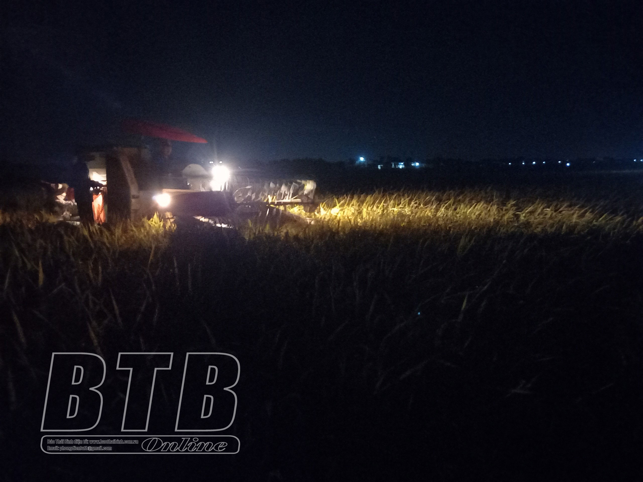 Nông dân xã Phú Châu (Đông Hưng) thu hoạch lúa đêm.